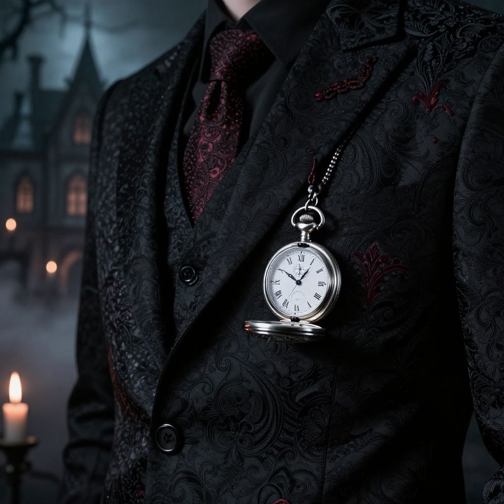 Close-up of a gothic black suit featuring baroque patterns and subtle dark red accents, paired with a silver pocket watch, gothic mansion background, eerie mist and candlelight