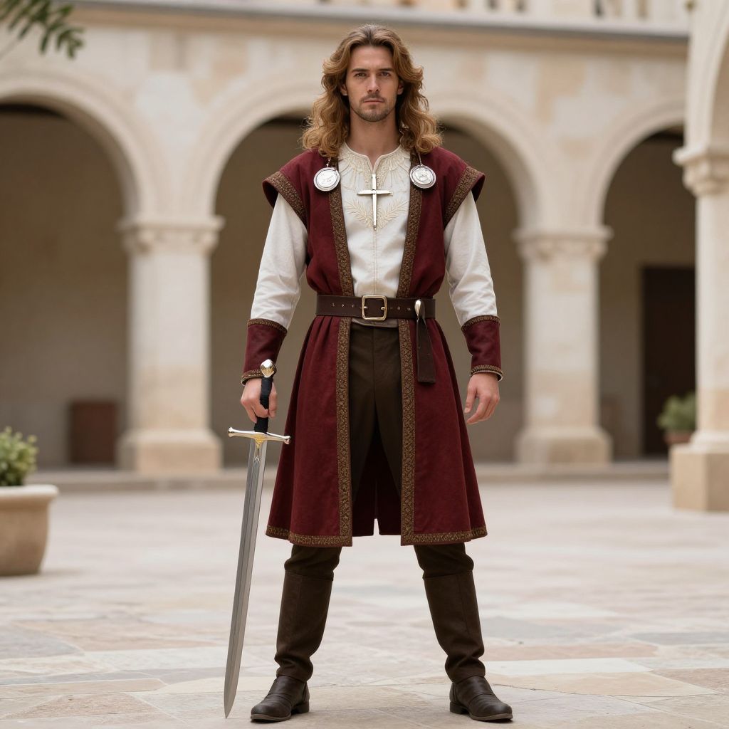 Photograph of a young man with long, wavy brown hair and a beard, standing in a stone courtyard with arched colonnades in the background. He wears a white long-sleeved shirt, a deep red velvet tunic with gold trim, black pants, and black boots. He holds a silver sword with a simple hilt in his right hand. His expression is serious, and he has two round, white medallions on his chest. The courtyard has potted plants and beige stone paving. The image has a slightly dramatic, medieval fantasy style.