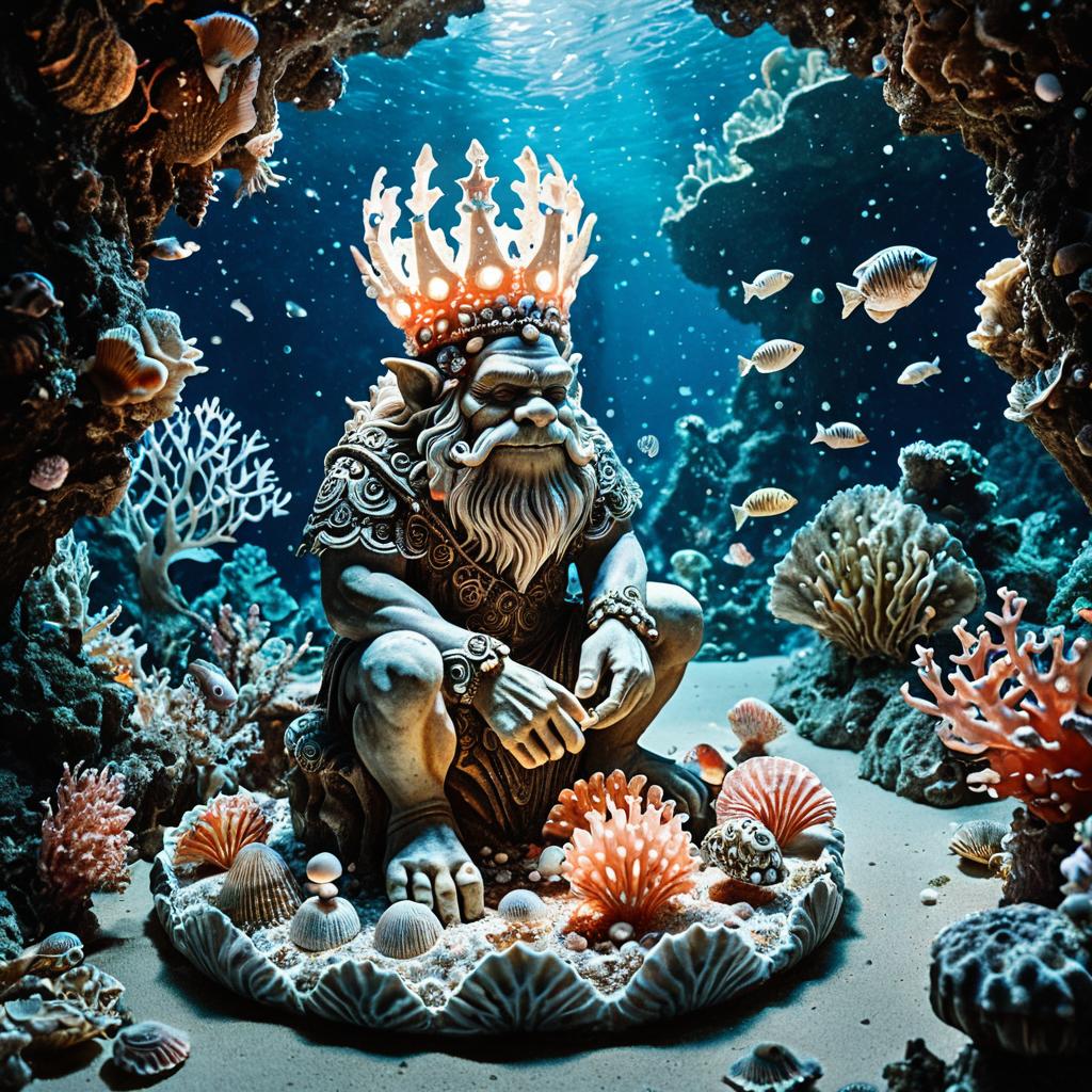 Surreal fantasy artwork of a troll sculptor carving an ornate sea-king's clam-shaped crown, in a submerged coral grotto glowing with kaleidoscopic fish, with whimsical mother-of-pearl tools, shells carving flakes, floating pearl dustacting fluid, soft and fantastical, highly imaginative and otherworldly