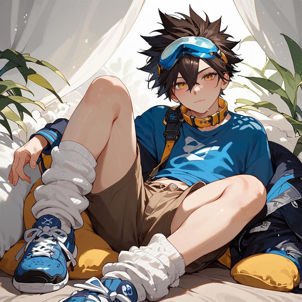 Score_9, score_8_up, score_7_up, score_6_up, score_5_up, score_4_up, source_anime, looking at viewer, 1boy, solo, taichi, brown hair, spiked hair, hair between eyes, goggles on head, blue shirt, yellow collar, brown shorts, white socks, loose socks, white and blue sneakers, grinning