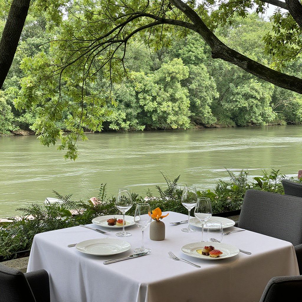 Savoring gourmet elegance amidst the lush embrace of nature, this serene riverside retreat invites a meditative escape where the symphony of rustling leaves and flowing waters harmonizes with the artistry of fine dining.