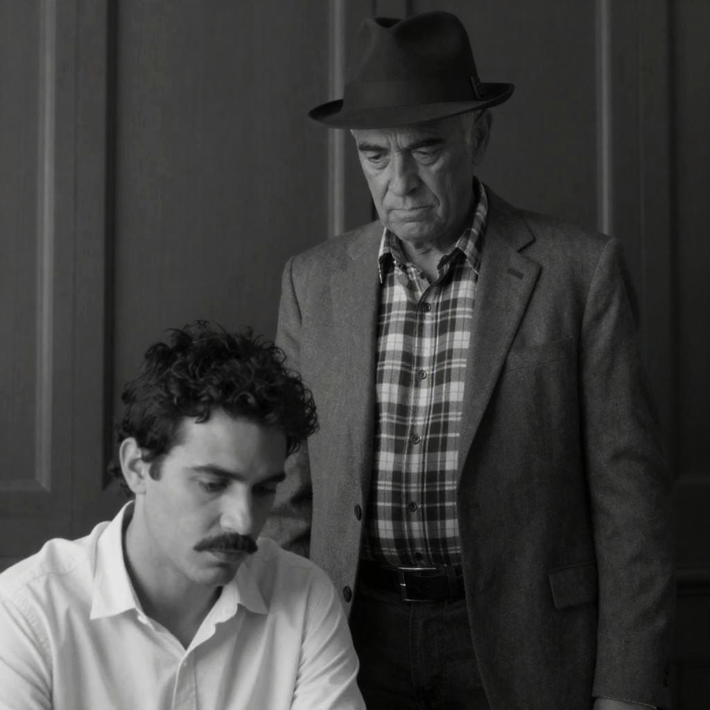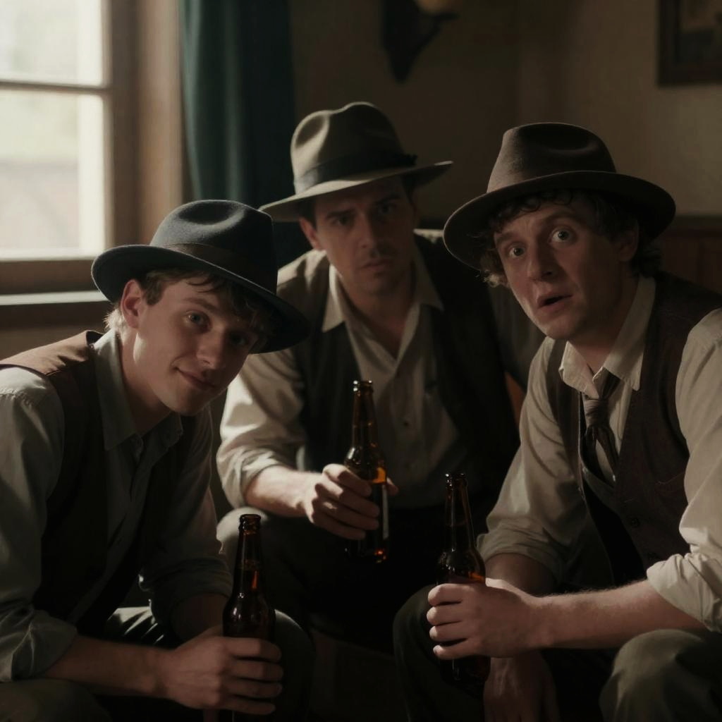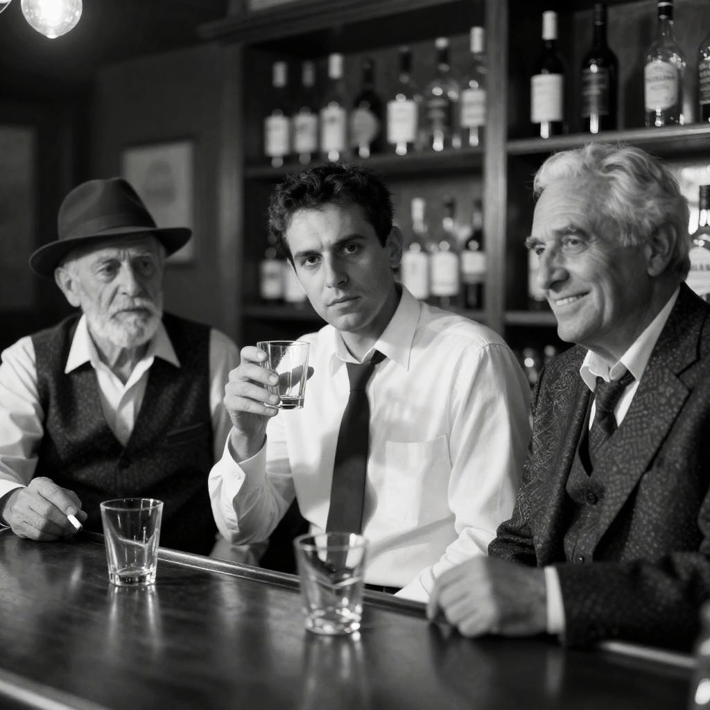 Black and white photograph of three men sitting at a bar. Elderly man with beard, hat, and patterned vest on left, holding a cigarette. Middle man with white shirt and tie, serious expression, holding a glass. Elderly man with gray hair on right, smiling, wearing a patterned suit. Shelves in background with various bottles. Middle man raises his hand as if speaking. Glasses and ashtray on bar counter.