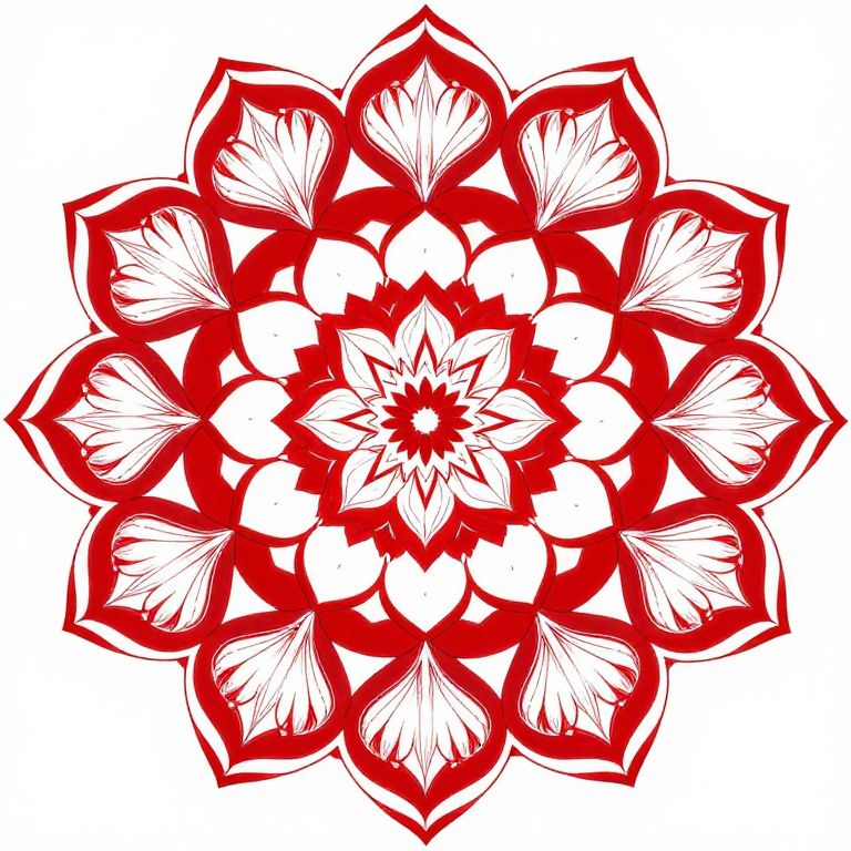 An intricate mandala of red and white blooms radiates serenity, inviting contemplation and a sense of timeless harmony, while its symmetrical patterns evoke a meditative journey into the depths of inner peace.