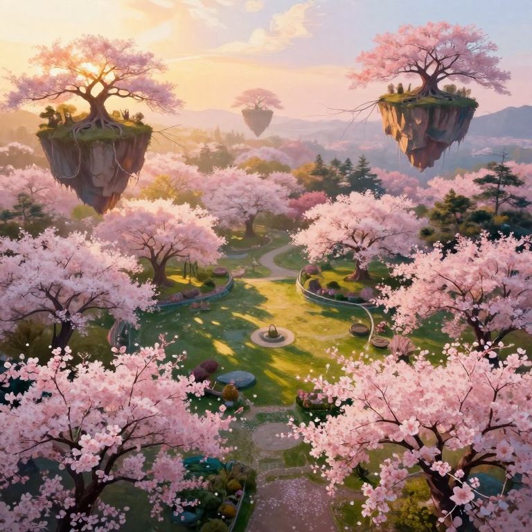 Create an impressionistic scene from a bird's-eye view, featuring a tranquil garden overflowing with oversized, luminous cherry blossoms bathed in the warm glow of golden hour sunlight. The image should be characterized by vibrant brushstrokes that blend colors and shapes to create a dreamlike atmosphere, while incorporating surreal elements such as floating islands adorned with ancient trees whose roots stretch towards the sky, forming an ethereal canopy above the garden. Emphasize the interplay between light and shadow to capture both tranquility and mystery in a single moment through a magical emotional gradient.