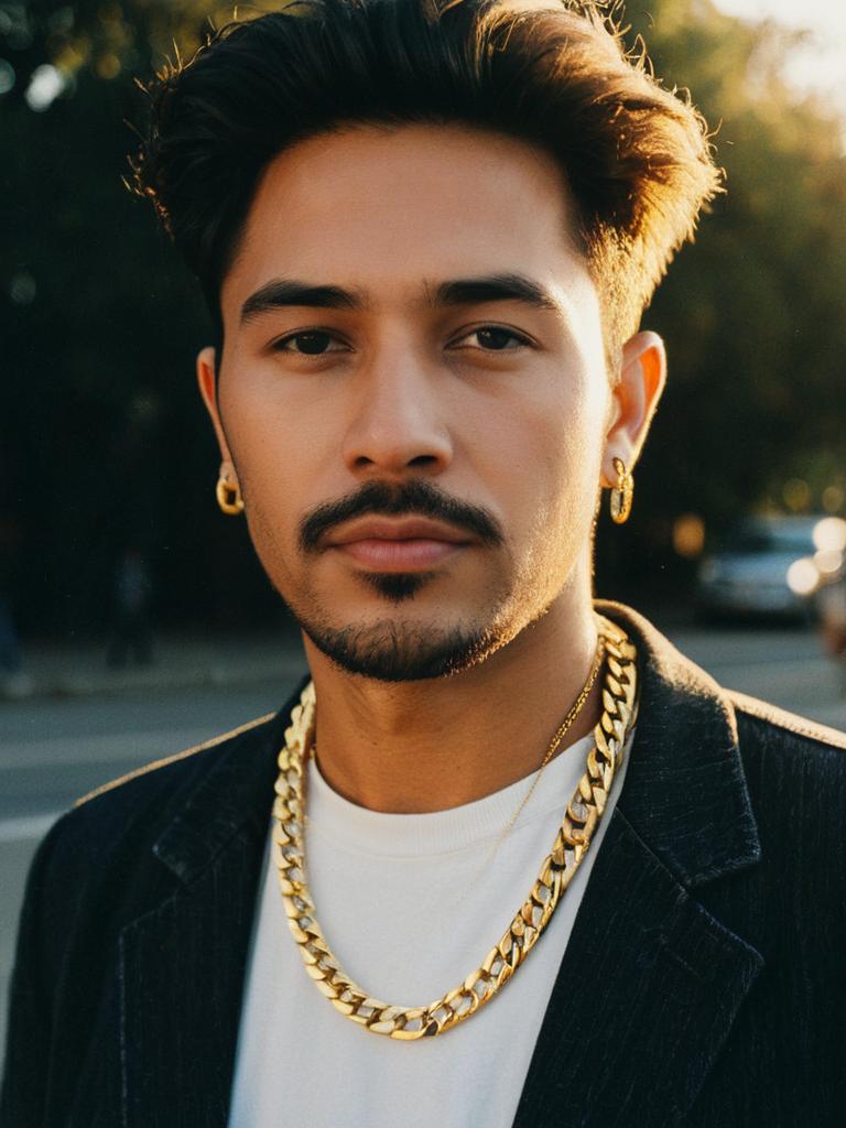 Man wearing Gold Jewelry Chain, outdoor candid portrait in golden hour