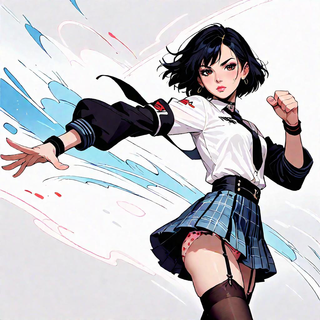 Score_9, score_8_up, score_7_up, score_6_up, score_5_up, score_4_up, source_anime, screenshots, 1girl, small breasts, black choker, white shirt, necktie, plaid skirt, wristband, detached sleeves, black thighhighs, garter straps, looking at viewer, kicking, strawberry print panties