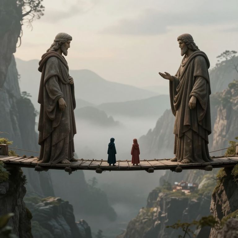Photograph-like CGI image depicting two colossal, stone statues of robed figures standing on a narrow, wooden suspension bridge between towering, mist-covered mountains. Between them, three small, colorful figures stand, each dressed in different hues: blue, red, and green. The statues, with detailed facial features and flowing robes, face each other, one with arms raised. The bridge has wooden planks and rope supports, with scattered moss. The background showcases a foggy, mountainous landscape with distant, hazy peaks and a soft, diffused light from the sky. The overall atmosphere is mystical and serene.
