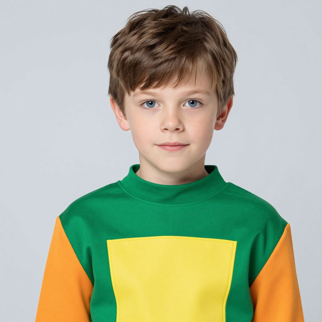 Boy with brown hair and blue eyes wearing a green and yellow costume with orange sleeves and a green collar.
