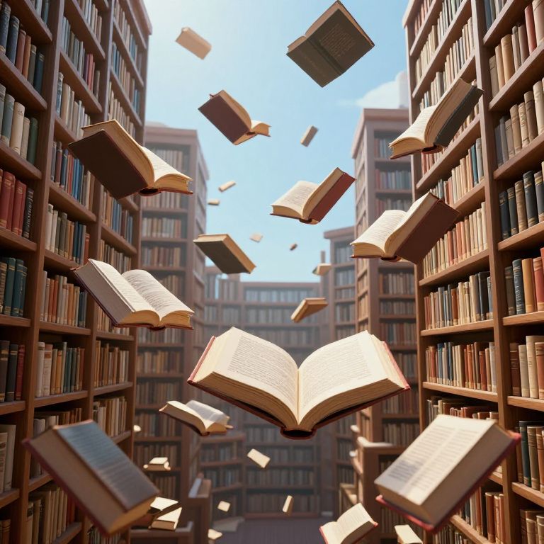 This digital artwork depicts a library scene with tall, wooden bookshelves filled with books on both sides, converging towards a bright, sky-blue background at the center. Numerous open books of varying sizes float mid-air, as if levitating, with sunlight casting gentle shadows on their pages. The books are arranged in a dynamic, upward motion, creating a sense of movement and magic. The wooden shelves have a warm, brown tone, contrasting with the white and yellowish pages of the books. The image exudes a whimsical, dreamlike atmosphere, blending realism with fantasy elements.