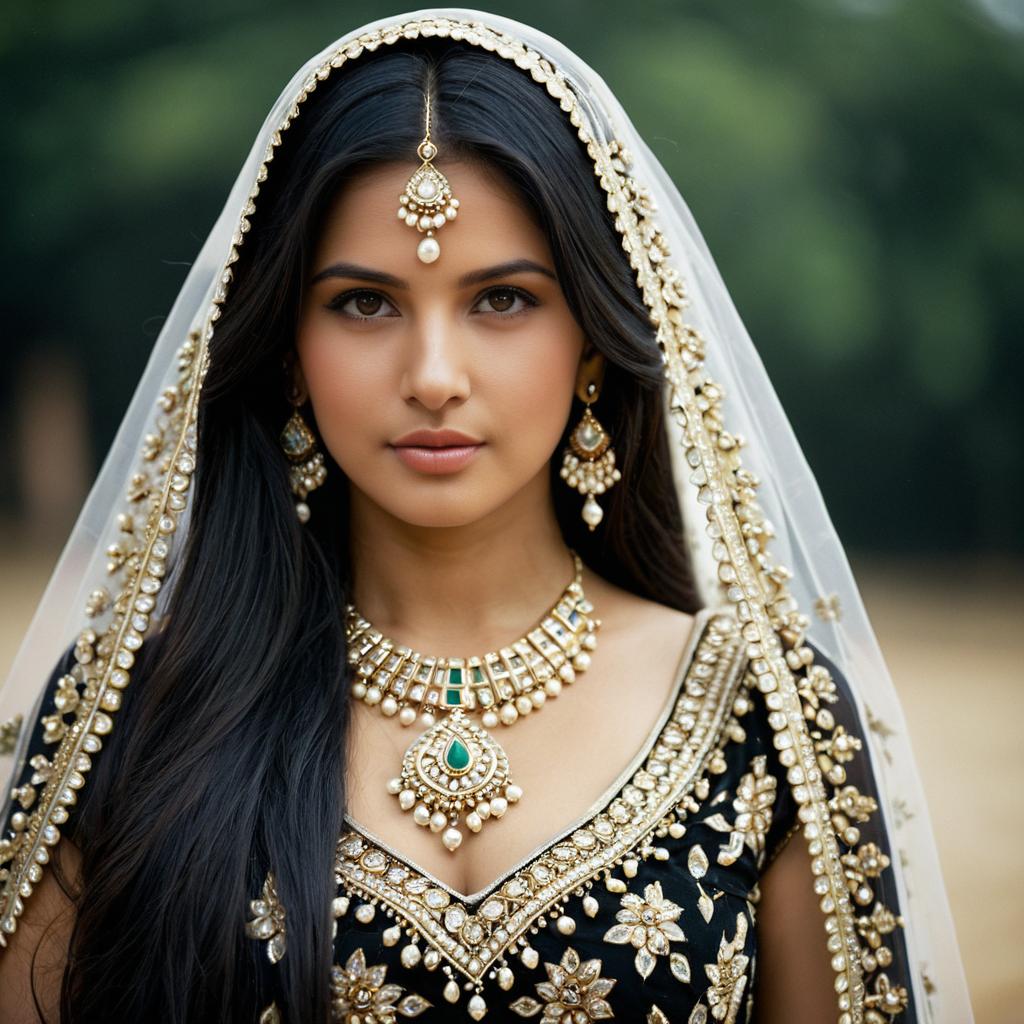 Portrait of an Indian bride wearing a traditional red sari adorned with intricate gold embroidery. She has black hair styled under a sheer white veil with gold embellishments. The bride is accessorized with elaborate gold jewelry including a necklace, earrings, a maang tikka on her forehead, and a subtle bindi. The background is softly blurred to emphasize the subject.
