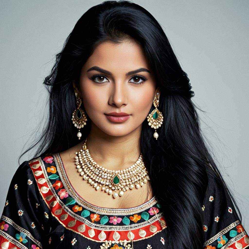 Sari wedding,1girl, jewelry, solo, bracelet, earrings, black hair, necklace, ring, looking at viewer, veil, blurry, blurry background, arabian clothes, midriff, realistic