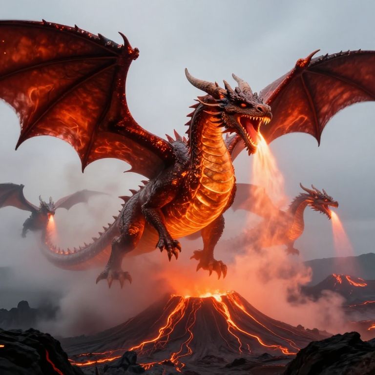 Majestic dragons in flight over a volcanic landscape, immense serpentine bodies glowing with fiery veins, smoke and ash billowing around them as they emit sonic roars, dramatic lighting highlighting their mythical power and grandeur.