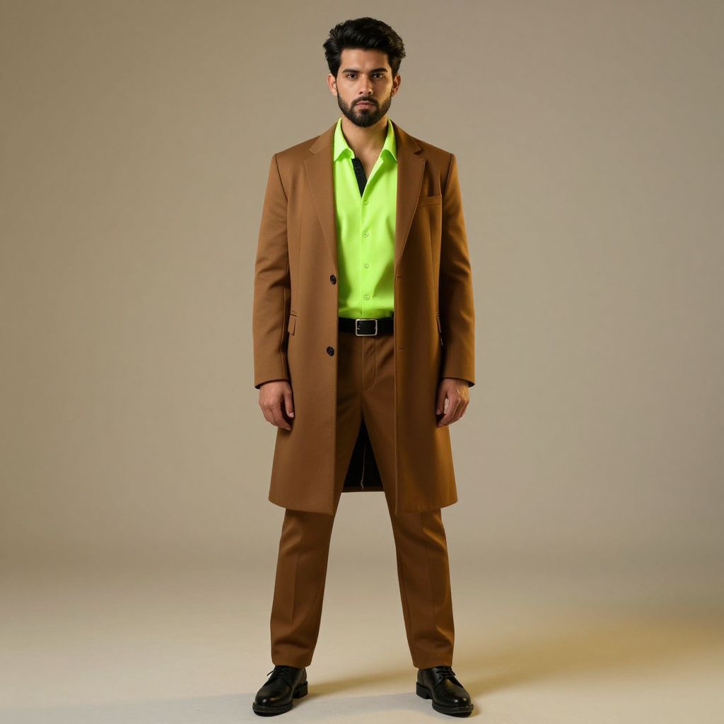 Photograph of a man with a dark, neatly trimmed beard and short, dark hair, standing against a plain beige background. He wears a long, brown, double-breasted overcoat with large buttons, over a bright neon green dress shirt, and black trousers. His black leather shoes are polished and he stands with his arms slightly away from his body. His expression is serious and focused. The lighting is even, highlighting the contrast between his neon shirt and brown coat. The overall style is modern and sophisticated, with a hint of bold fashion.