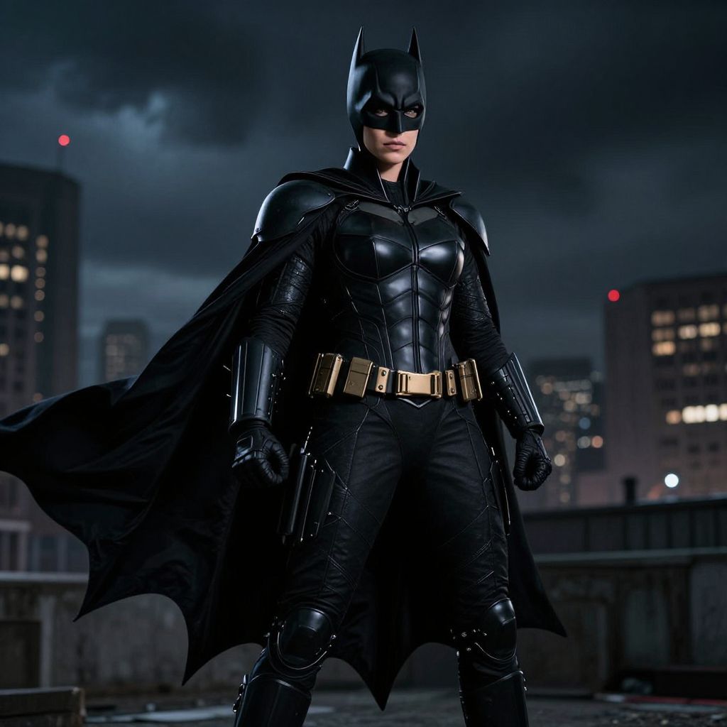 A woman dressed in a detailed black Batman costume, wearing a classic black mask that covers her face, with sharp, angular features and a menacing expression. She has a full black cape flowing dynamically behind her, adding depth and motion to the scene. Her outfit includes a sleek, fitted bodysuit with reinforced armor-like details, gauntlets, and boots, all in a dark, polished black tone. The lighting is dramatic, with shadows emphasizing the intensity of her presence, and the background is a dark urban cityscape under a stormy night sky, enhancing the mysterious and bold atmosphere of the scene.