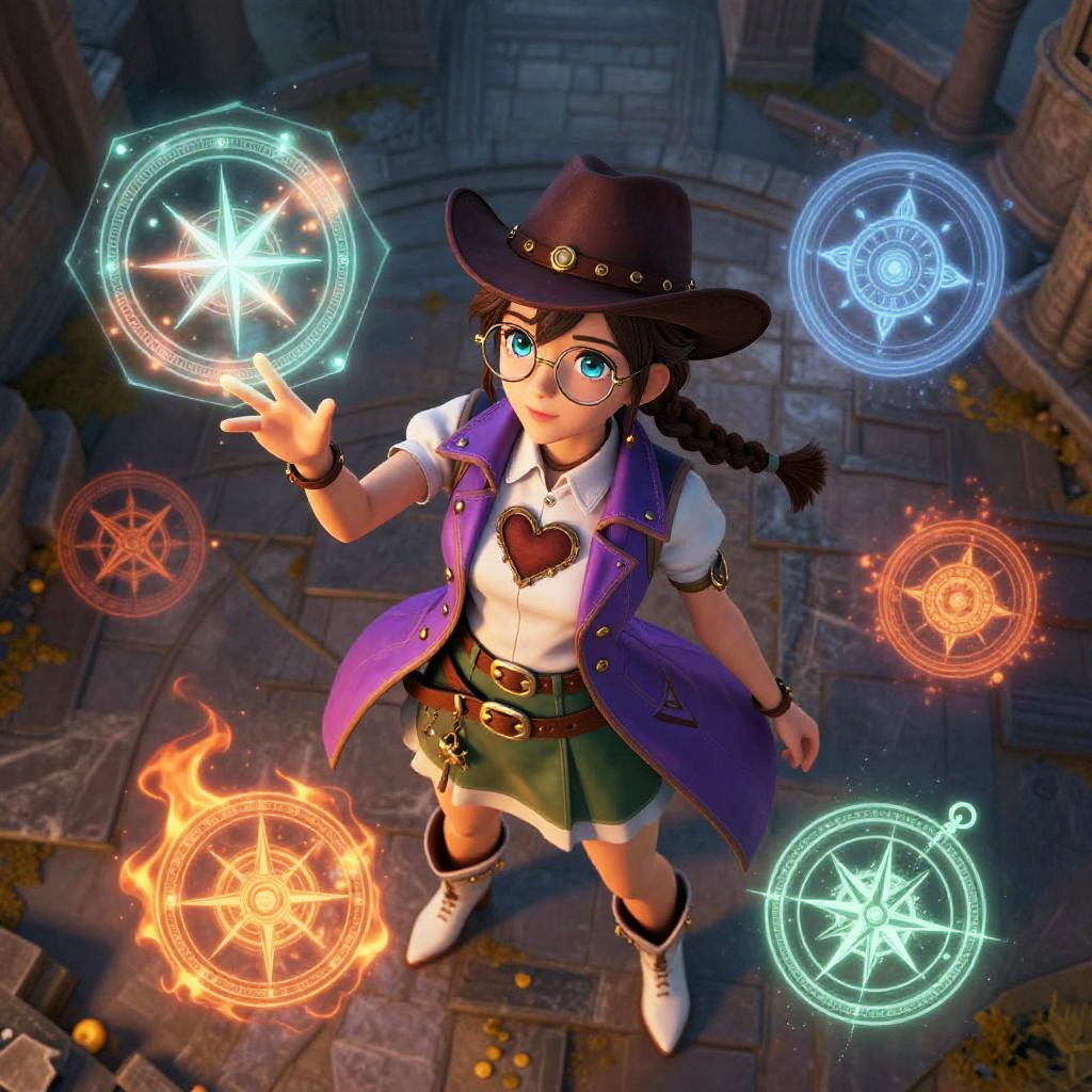 Absurdres, (best quality), (masterpiece), (ultra-detailed:1.2), (photorealistic:1.4), (highres), reflection, (cowboy shot:1.2), spell, (from above:1.2), looking up, 1girl, cute anime girl, emma millstein, glasses, newsboy hat, braided ponytail, purple sleeveless coat, white shirt, green skirt, belts, white boots, glowing eyes, (magic circle:1.5), (hologram:1.3), (Quadruple Oblong:1.3), compass, fire magic, (zentangle:1.1), ancient castle, heart on chest