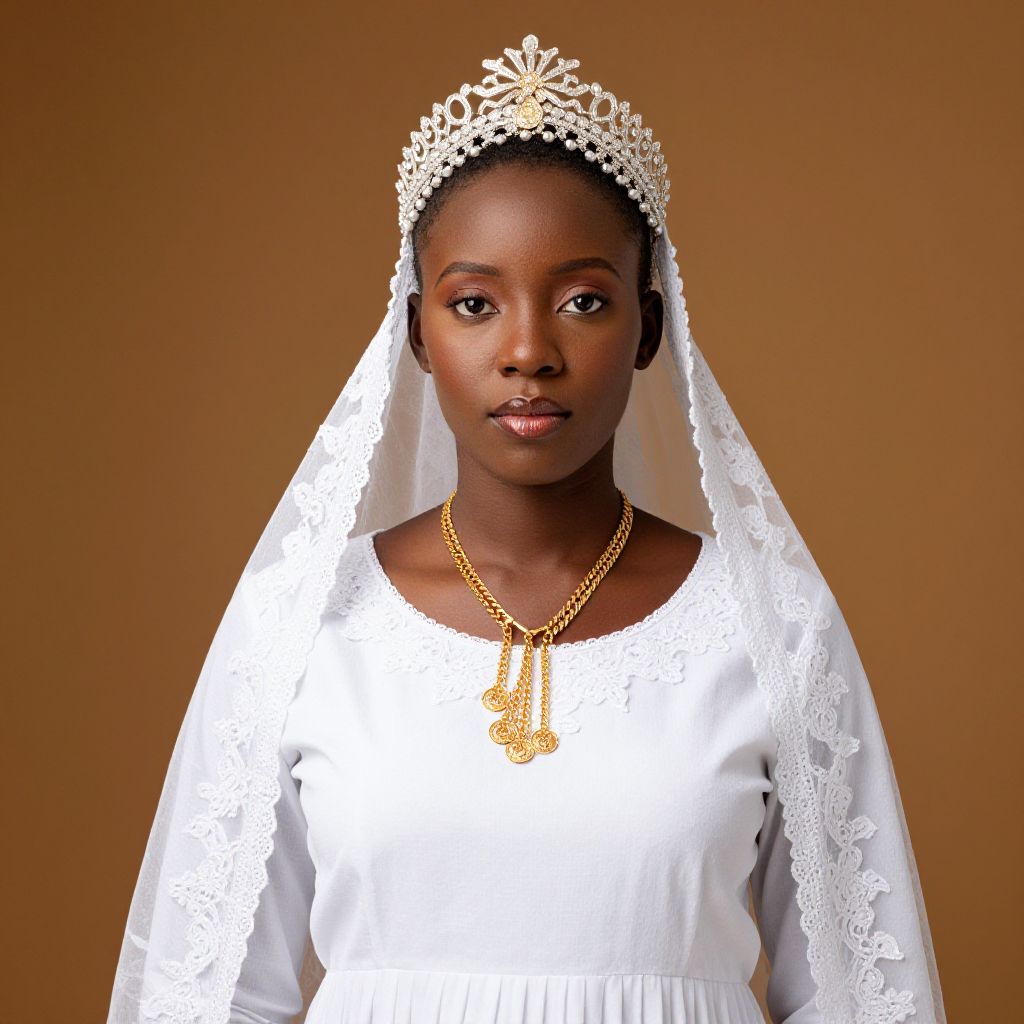 "Xhosa Wedding Dress Design, woman in a white dress and headdress with a gold necklace"