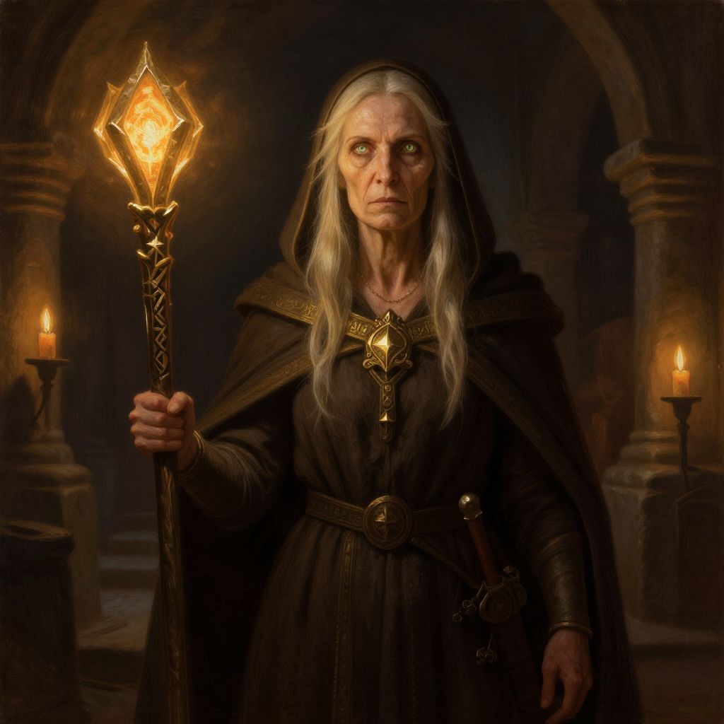 A digital fantasy artwork features an elderly woman with long, white hair and pale skin, standing in a dimly lit, medieval stone archway. She wears a black, hooded cloak with ornate gold embroidery, and a matching dress belted at the waist. She holds a glowing, ornate staff with a hexagonal, amber crystal top in her right hand. Her intense, blue eyes gaze forward. Two lit candles in tall, metal holders flank her on either side, casting a warm glow against the dark background. The image has a realistic, yet slightly magical, atmosphere.