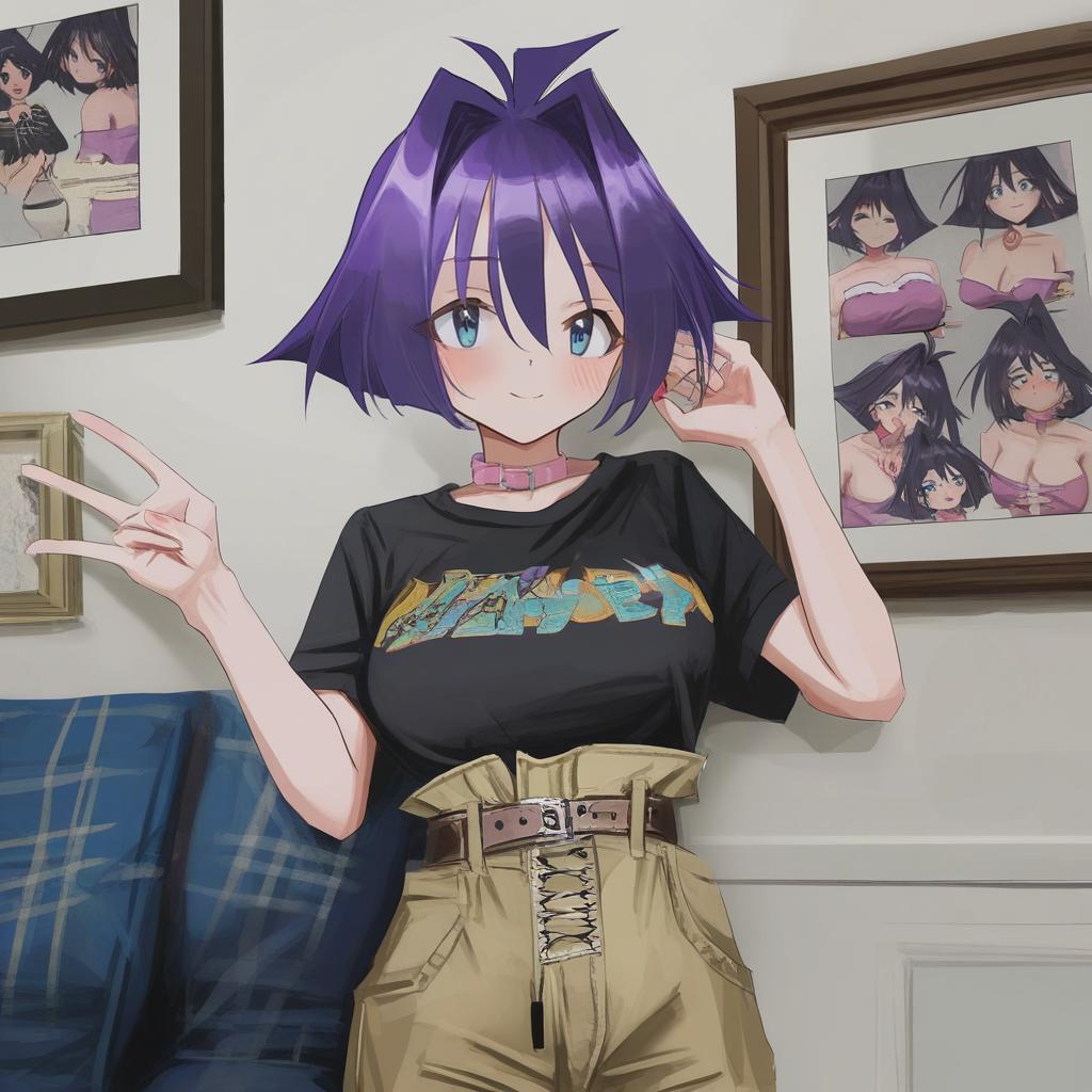 Amelia wil tesla seyruun, slayers, 1girl, blue eyes, short hair, purple hair, medium breasts, large breasts, pink choker, by artist nadegata, leet