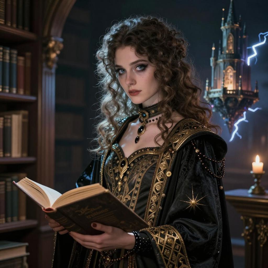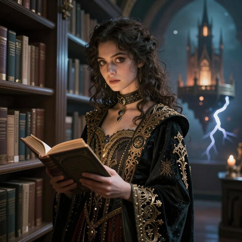(tokki girl), (Masterpiece:1.1), (best quality:1.1), ((chromatic aberration)), ((caustic)), dynamic angle, ((ultra-detailed)), (illustration:1.1), ((disheveled hair)), beautiful detailed glow, detailed, Cinematic light, intricate detail, highres, ((lomography, full body portrait photo of women like reol holding dressed like witches in a library, open books, wearing an ornate robe and choker, moody, realistic, dark, skin tinted a warm tone, light blue filter, hdr, rounded eyes, detailed facial features, gold black, Wizard, (floating palaces:1.2), magic, black lightning magic)), trending on ArtStation Pixiv, high detail, sharp focus, smooth, aesthetic, rule of thirds