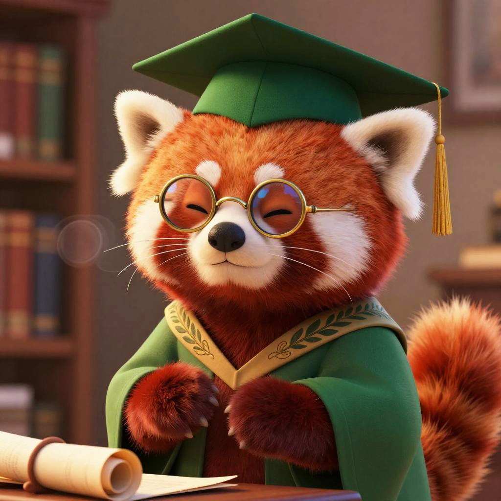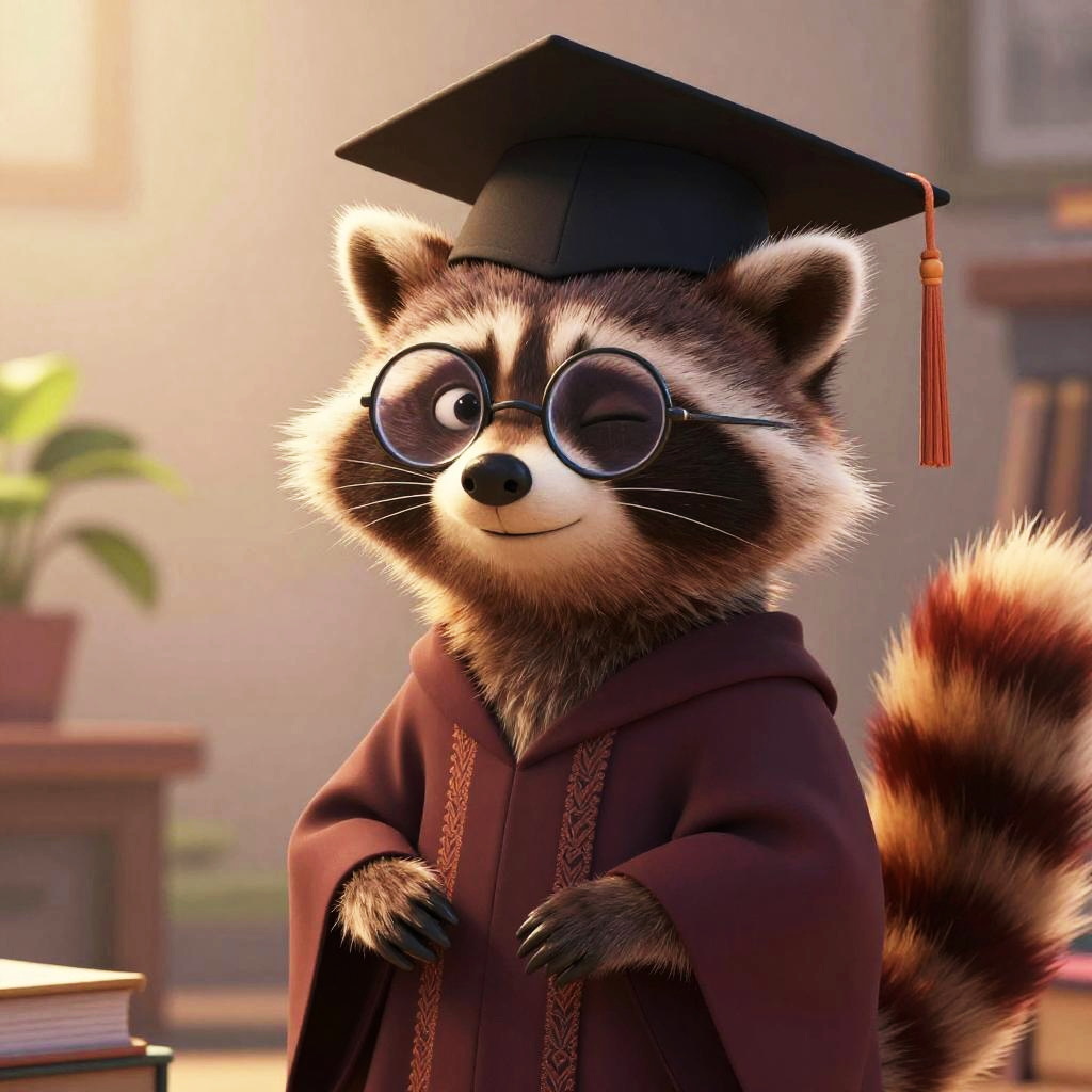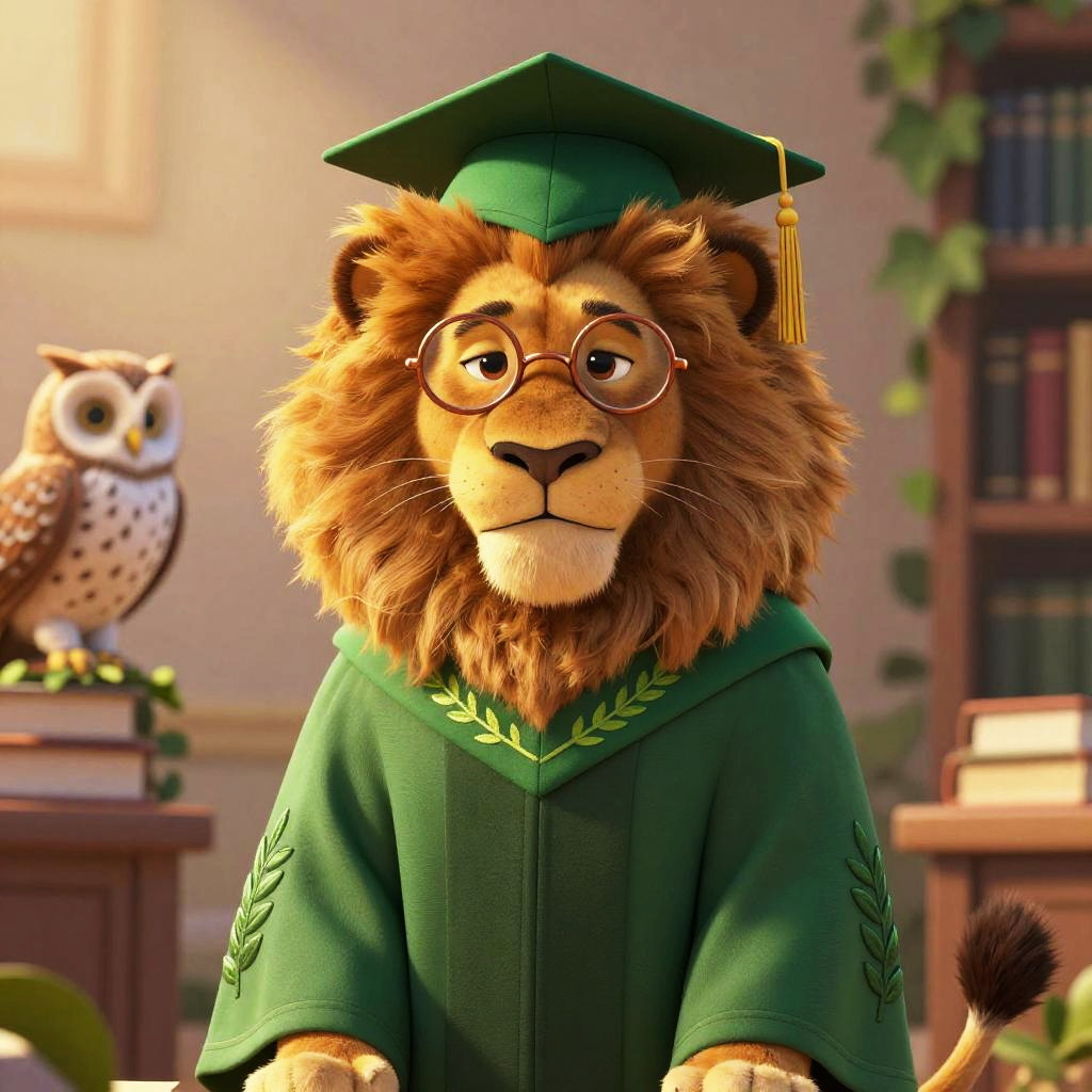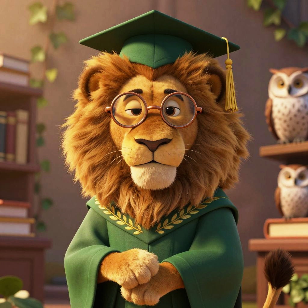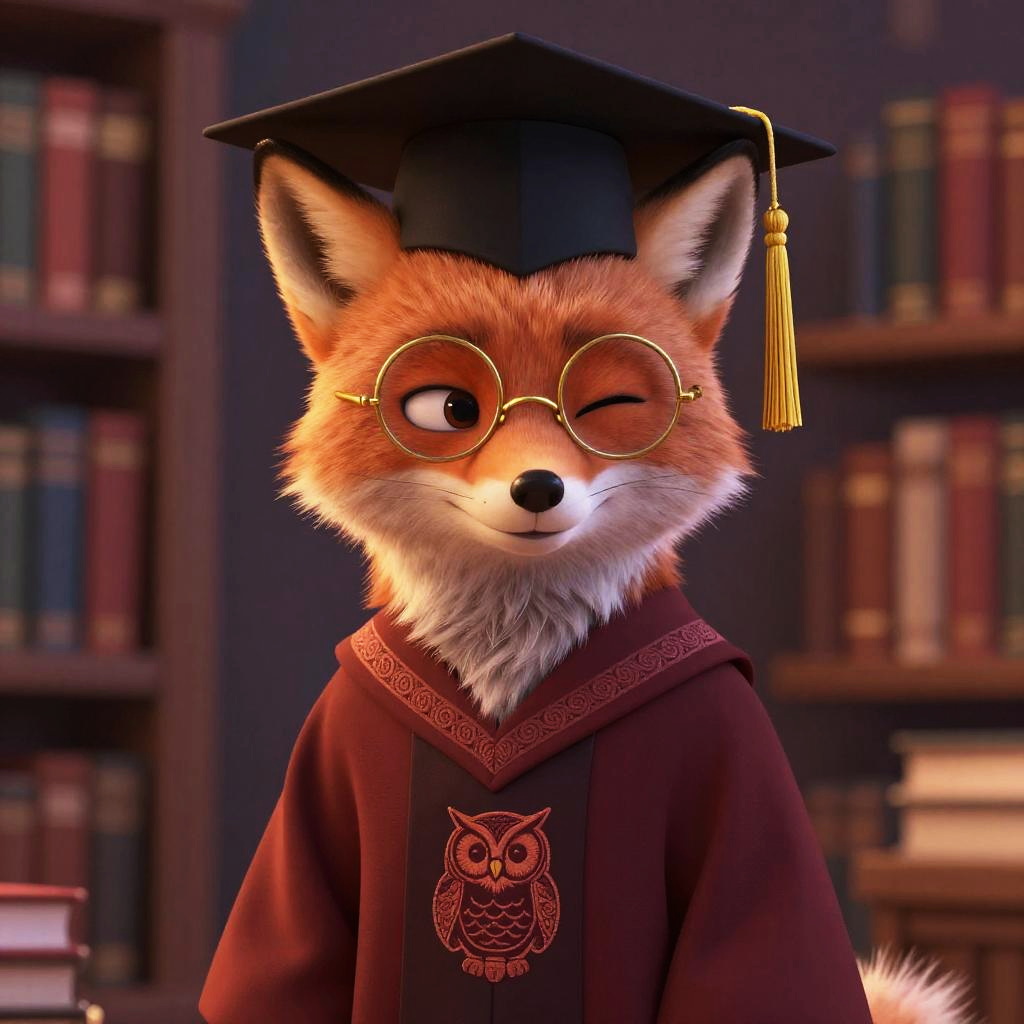 A realistic animated hedgehog wearing a blue academic cap and gown, round glasses, and holding a pen. The character has a wise expression and dignified scholarly look, set against a soft, ambient outdoor background resembling a courtyard with architectural arches.