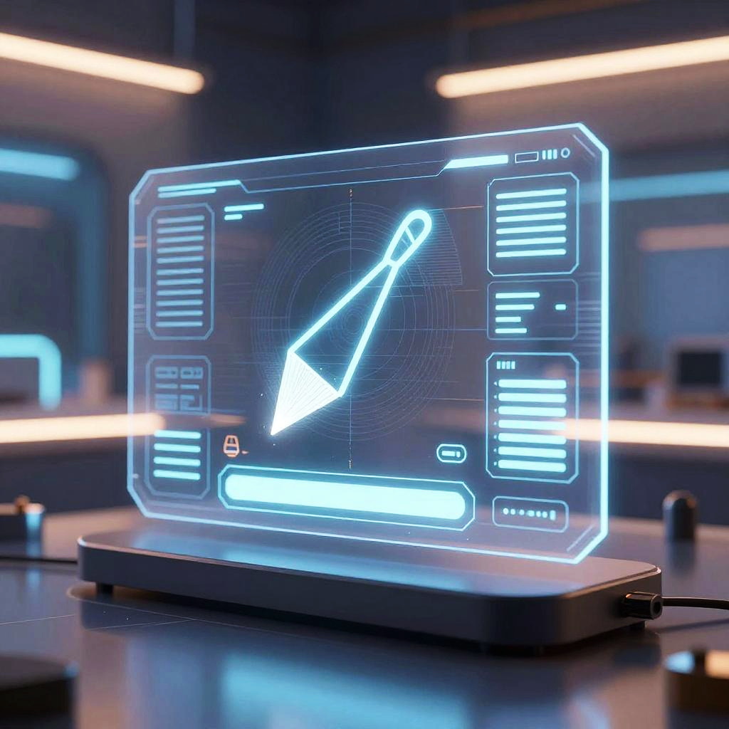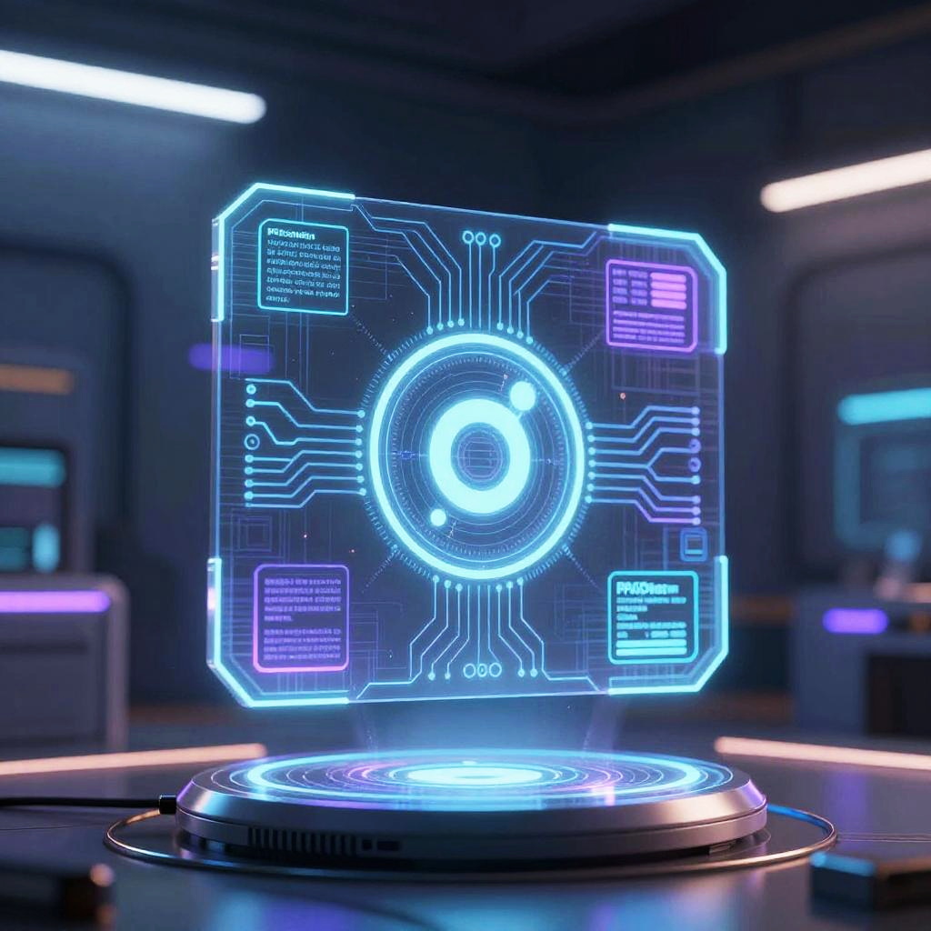 Photograph of a vintage black typewriter with two glowing, neon blue screens displaying holographic interface designs. The upper screen shows a circular interface with colorful lines and icons, while the lower screen mirrors the same interface. The typewriter rests on a wooden surface in a dimly lit room with neon lights in the background, creating a cyberpunk aesthetic. The typewriter's keys and metal parts are visibly worn, contrasting with the modern, digital holograms. The background is blurred, focusing attention on the illuminated typewriter.