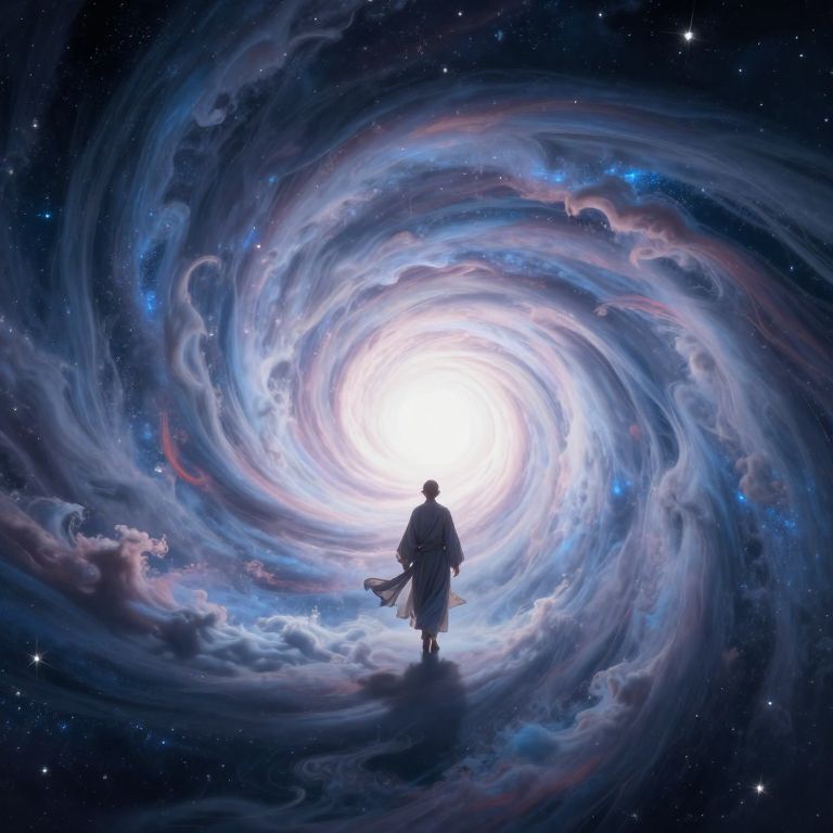 Spiraling clouds form concentric rings around a radiant vortex, as a solitary figure in flowing robes walks toward the luminous center, traversing a surreal cosmic landscape under a star-studded sky.