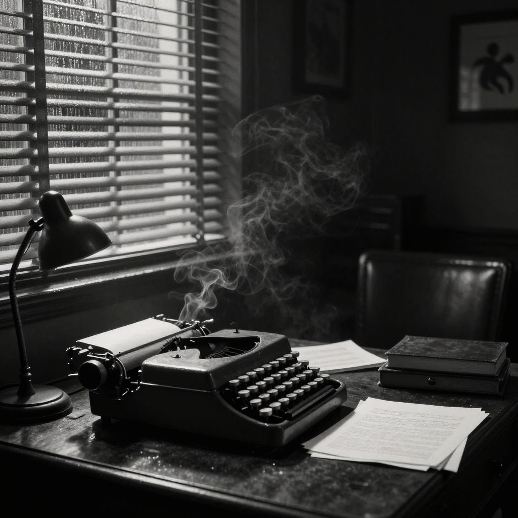 Film noir detective office, dimly lit with Venetian blinds casting shadows, cluttered desk with vintage typewriter, smoky atmosphere, rain-soaked window, moody monochrome palette