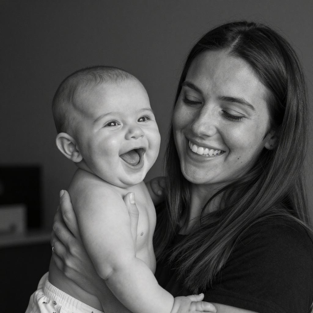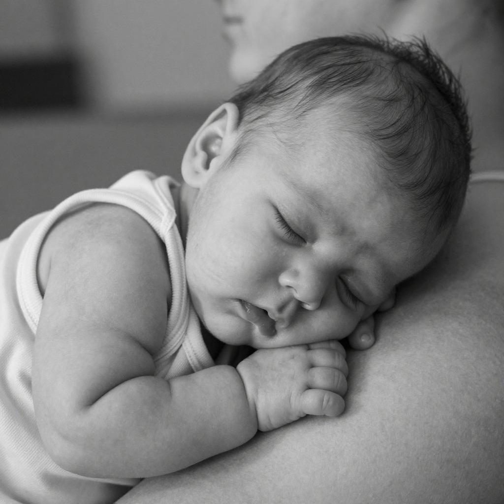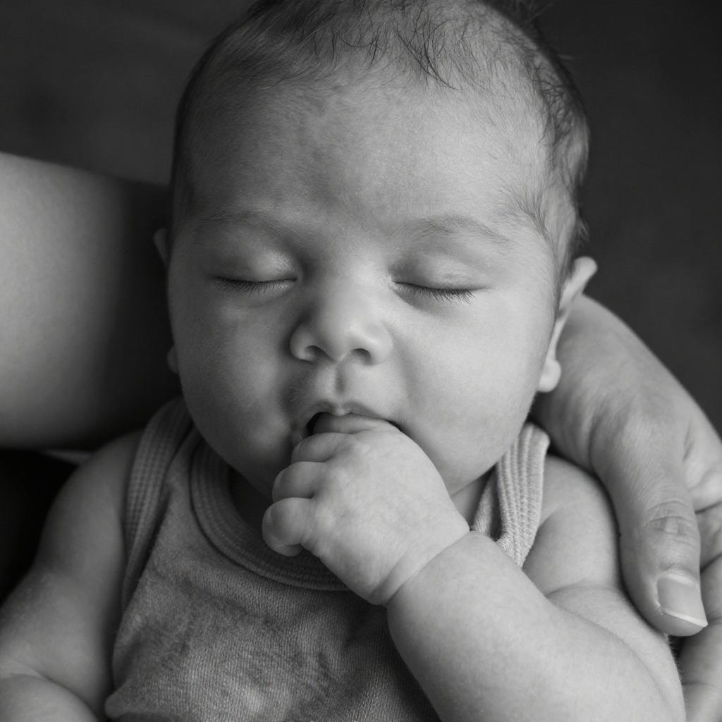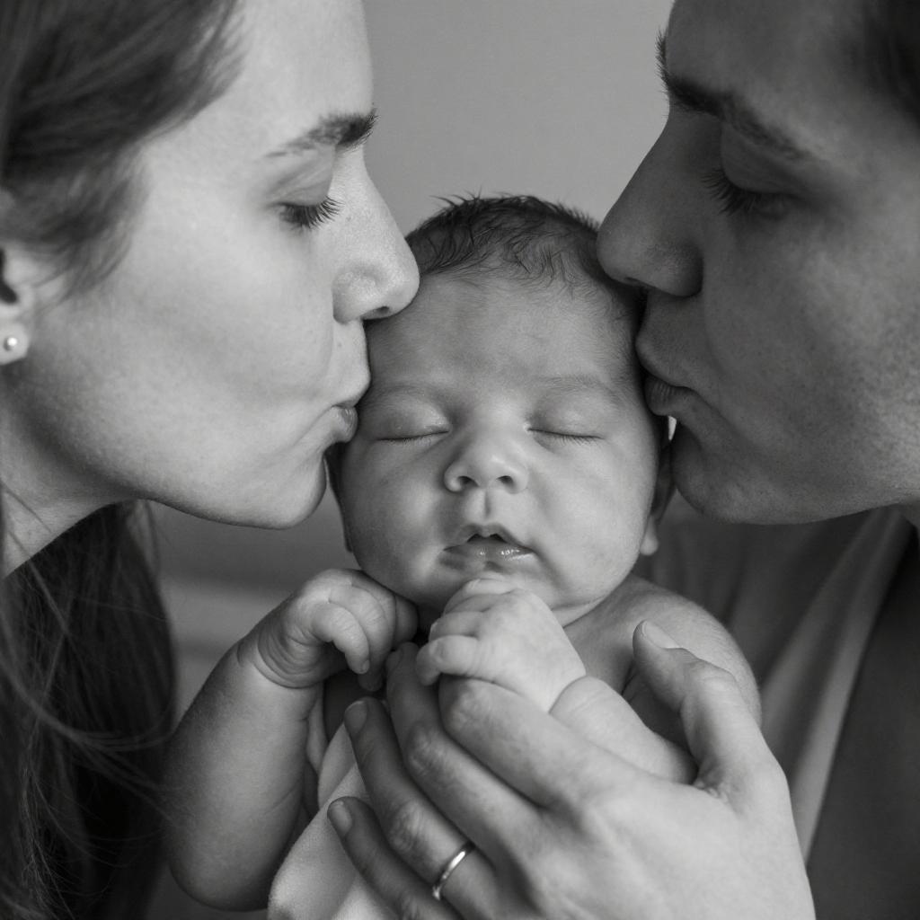 Black-and-white close-up photograph of a newborn with closed eyes, being gently kissed by both parents. The baby's small hands are cradled by the father's ringed hand and the mother's hand. Soft lighting highlights the baby's delicate features. The camera angle is slightly above eye level, with a shallow depth of field that keeps the baby in sharp focus while the parents' faces are softly blurred in the background.