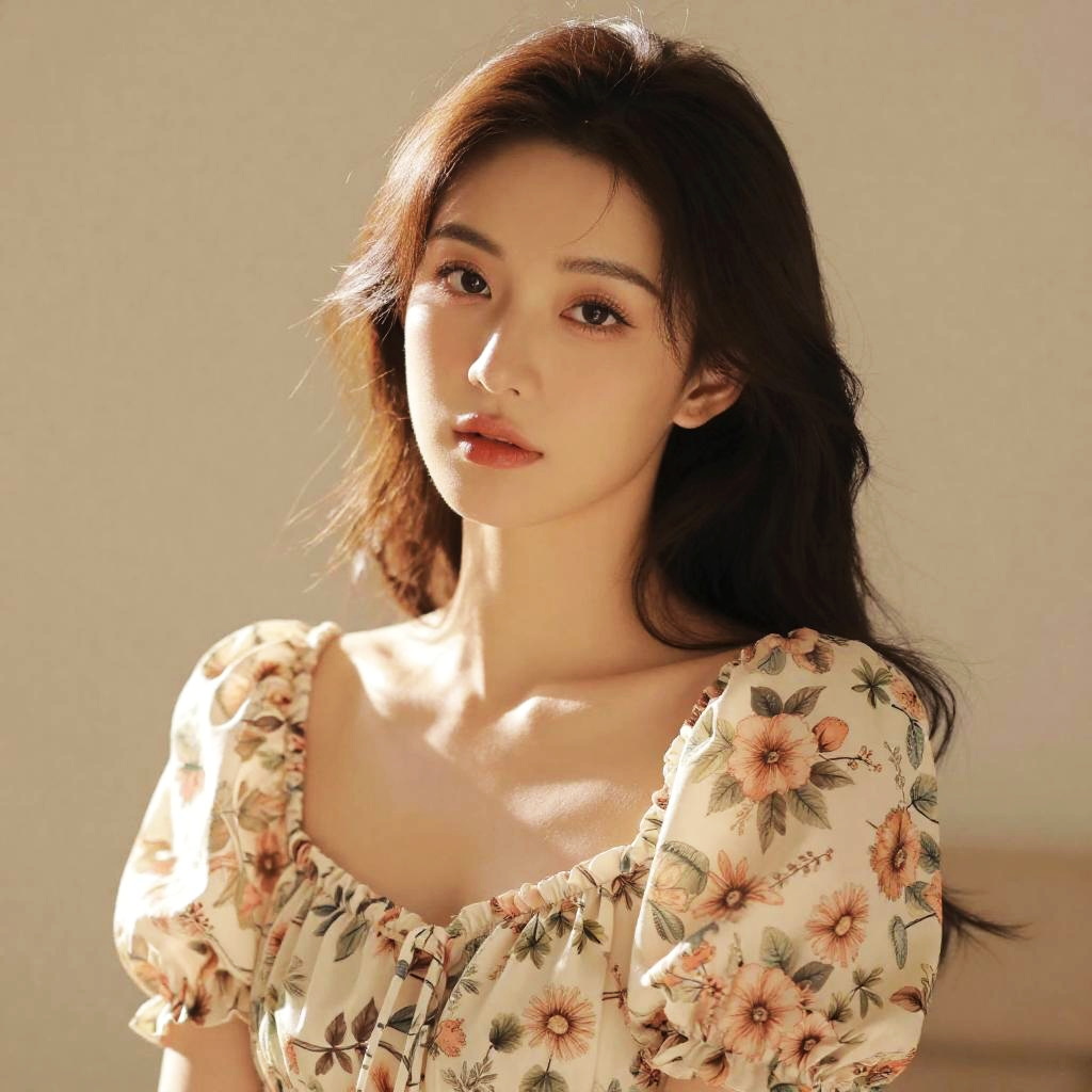 Photograph of an Asian woman with fair skin and long, dark brown hair. She is wearing a floral dress with puffed sleeves and a scoop neckline, adorned with pink and orange flowers. Sunlight illuminates her face, highlighting her soft features and slightly parted lips. Her expression is neutral, and she gazes directly at the camera. The background is a plain, light-colored wall, emphasizing her as the focal point. The image has a warm, natural light and slightly soft focus, giving it a gentle, serene atmosphere.