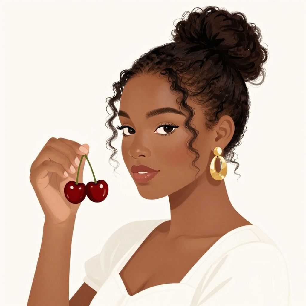 Elegant illustration of a young woman with dark skin and curly hair styled in a high bun, wearing gold earrings and a white top, delicately holding two vibrant red cherries with green stems while tilting her head slightly to the side.
