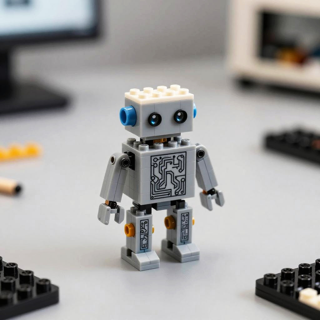 Close-up of AI Lego set building blocks, showcasing tiny circuit patterns integrated into classic Lego bricks, assembled into a small robot figure, modern tech workshop background, high resolution macro photography