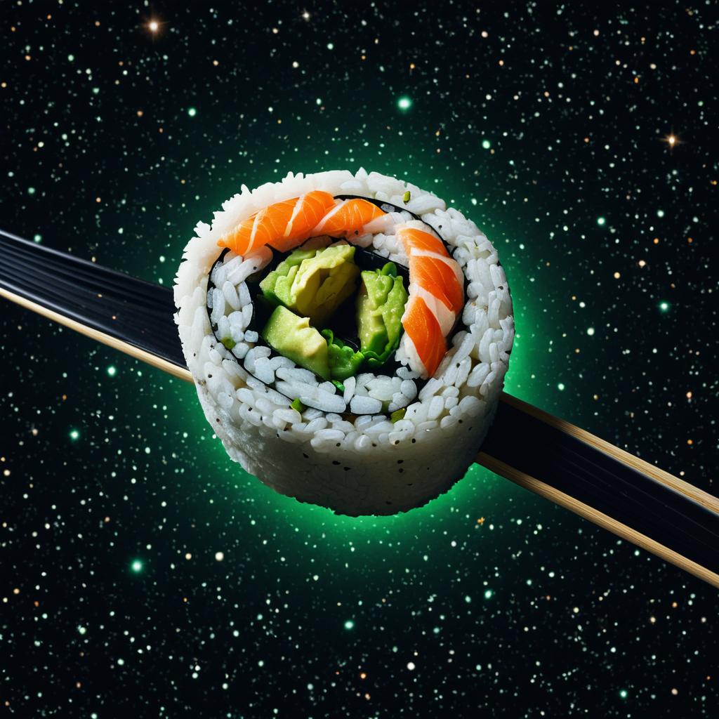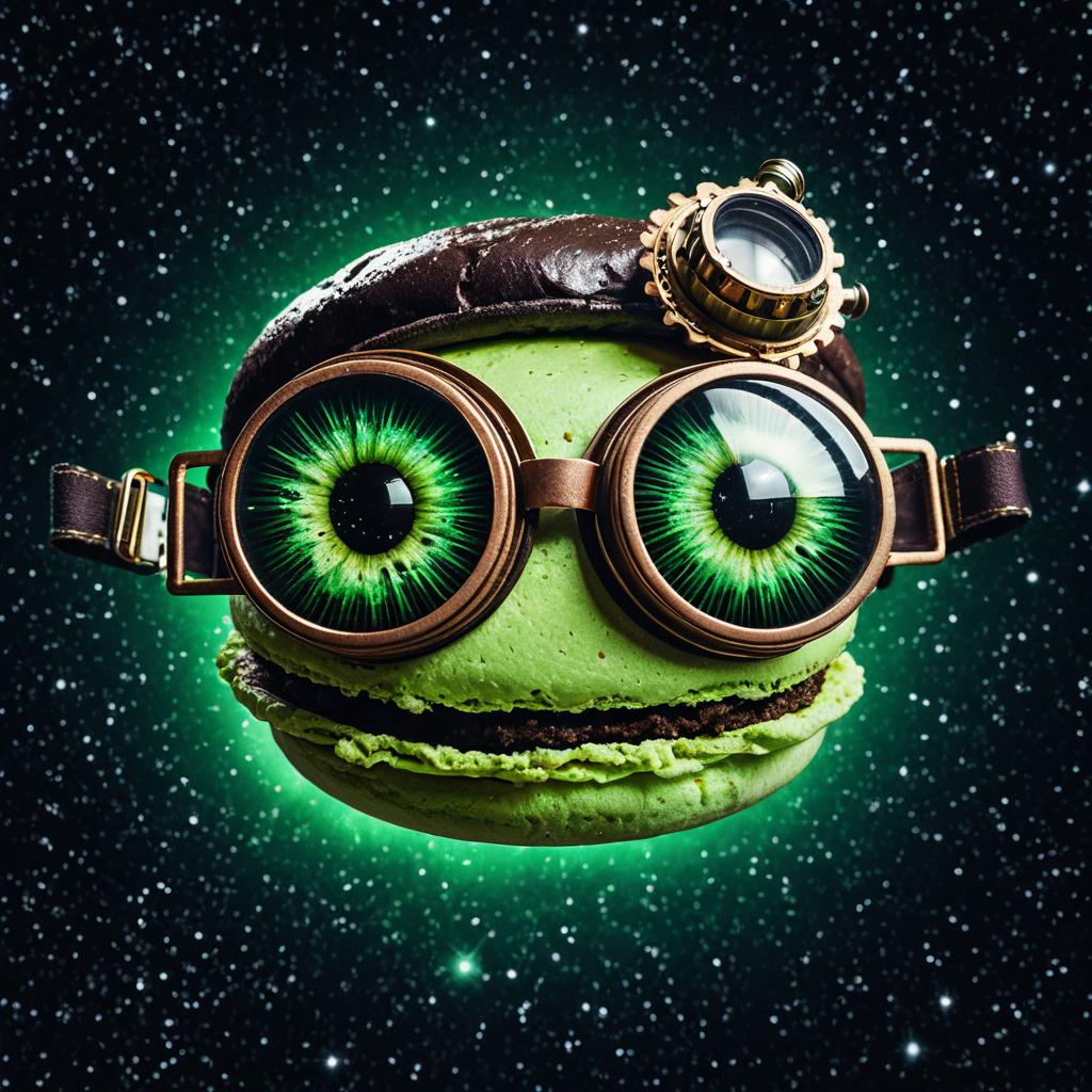 A surreal image of a donut in space wearing a space suit with bright purple eyes, medium shot, HD and 8K resolution, hyper-realistic, highly detailed, humorous and whimsical
