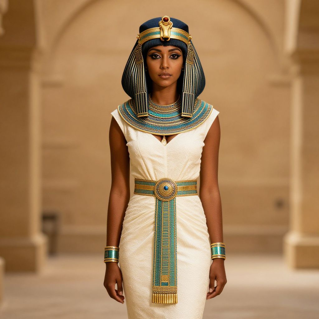 Cleopatra goddess costume, 1girl, long hair, jewelry, statue, solo, bracelet, black hair, realistic, dress, braid, crown, necklace, looking at viewer, white dress, blurry, breasts, standing