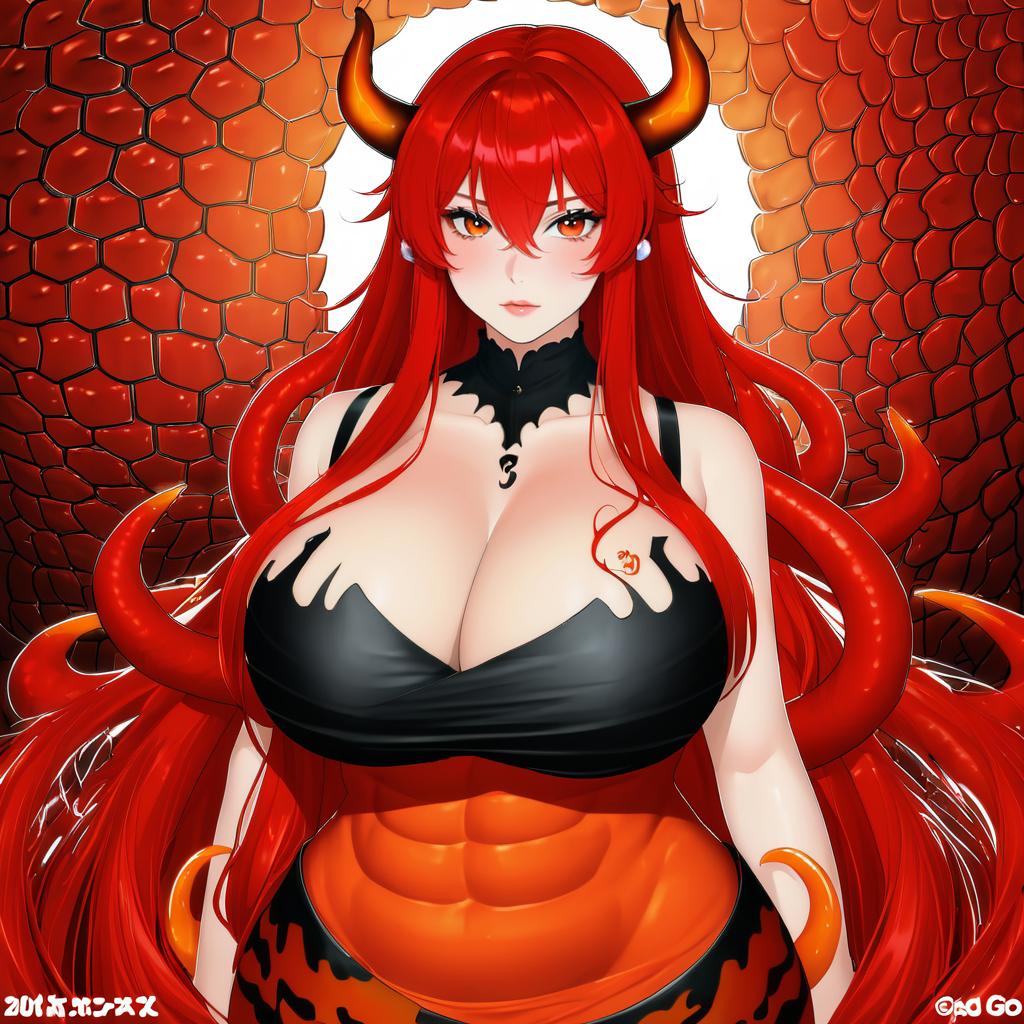 Dola (nijisanji), nijisanji, 1girl, dragon horns, dragon tail, red eyes, hair between eyes, red hair, long hair, very long hair, large breasts, huge breasts, cleavage, navel, virtual youtuber, virtual youtuber, dragon girl, by artist go-1, anime