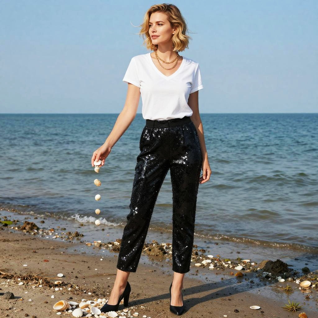 A woman in a casual chic outfit featuring a white v-neck t-shirt and ornate black sequined trousers, paired with black mid-heel shoes and layered gold necklaces, stands collecting seashells at low tide, her wavy short blond hair gently tousled by the sea breeze, all depicted in a vibrant seven seas visual style. Sexy. Pretty face and beutiful eyes
