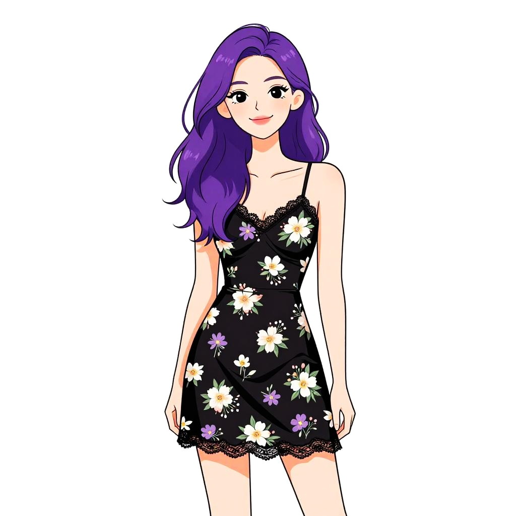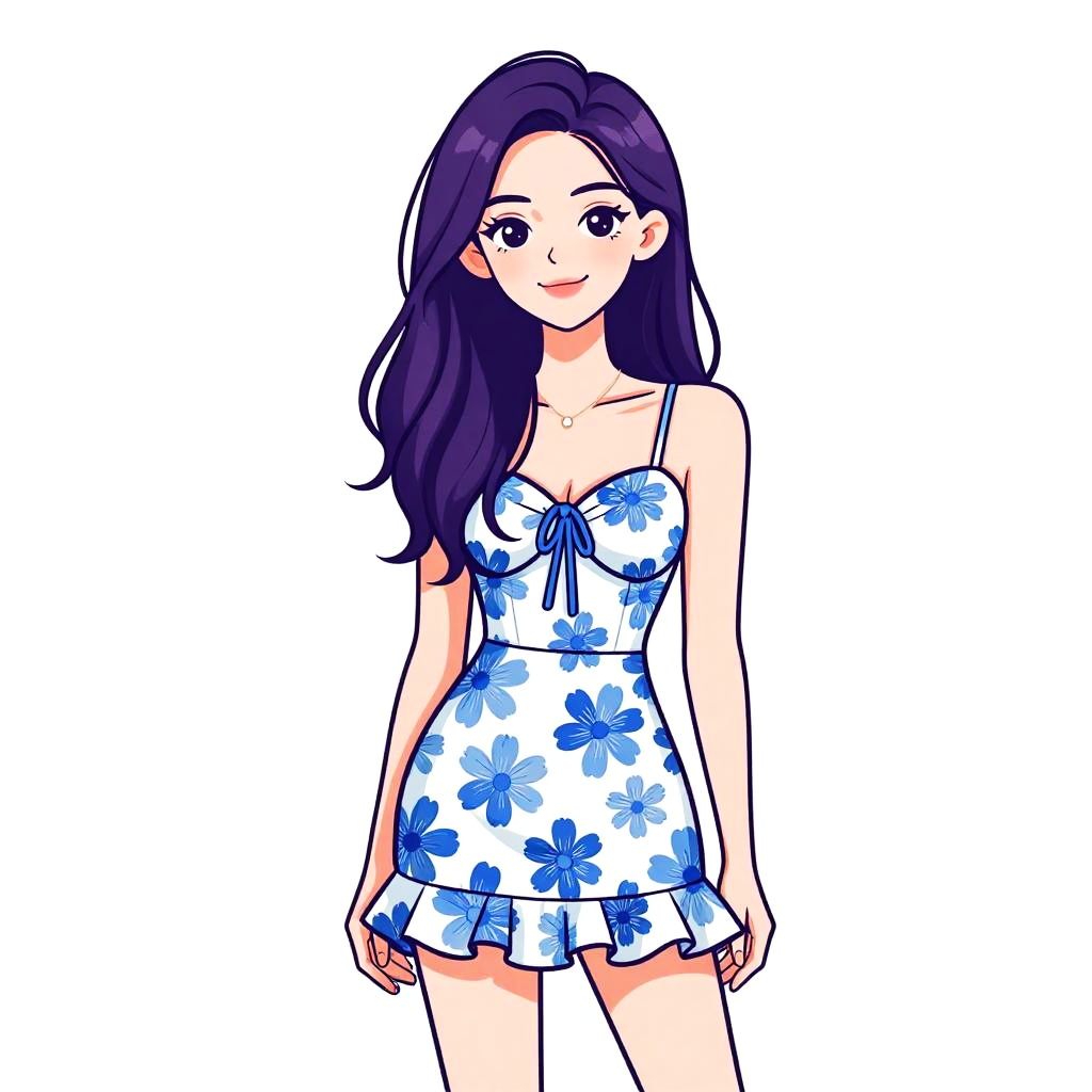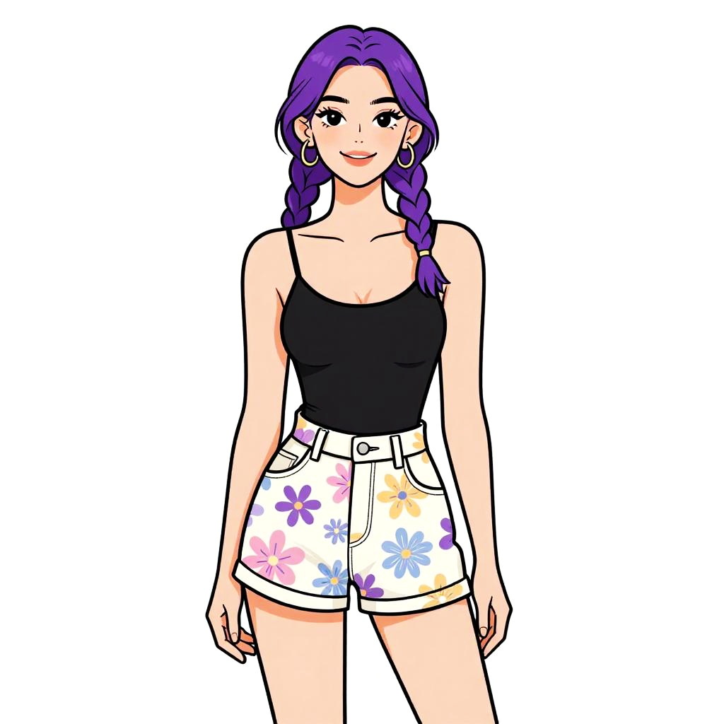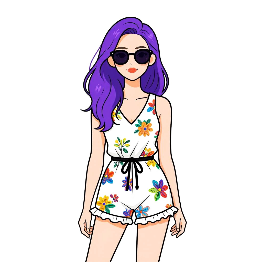 Woman with pretty face and pretty hair. Woman, casual summer style, white sleeveless romper with multicolored floral prints, V-neckline, cinched waist with black drawstring, frilled hem, above-knee length, wearing dark round sunglasses, white background. --sref 1467