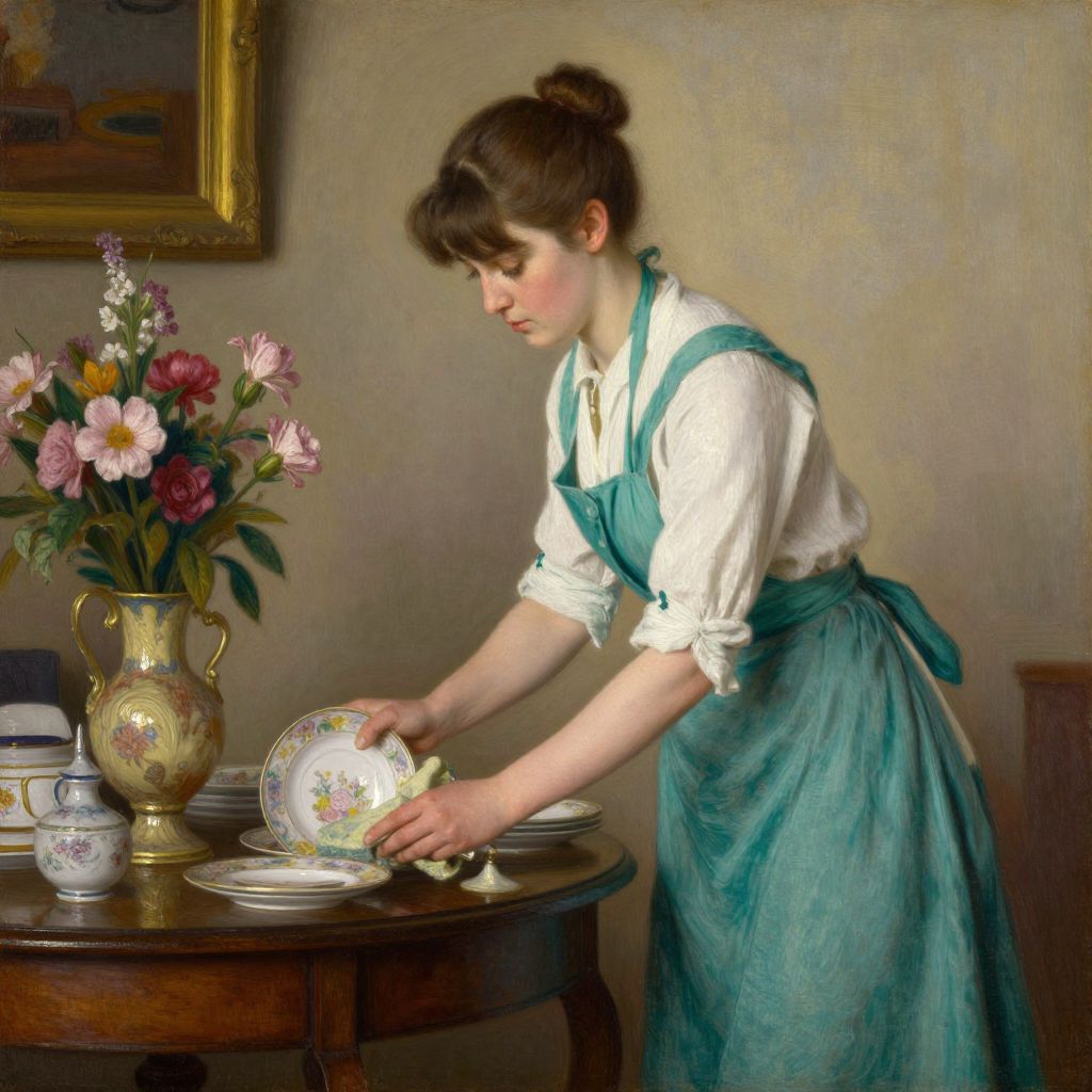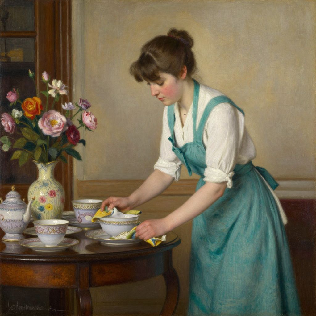 A vintage-style oil painting in the British 1930s Impressionist tradition depicts a woman in a teal apron and white blouse delicately cleaning china, set against a warm, nostalgic interior with soft lighting and a floral vase on a wooden table, capturing the essence of domestic life with a touch of artistic elegance.