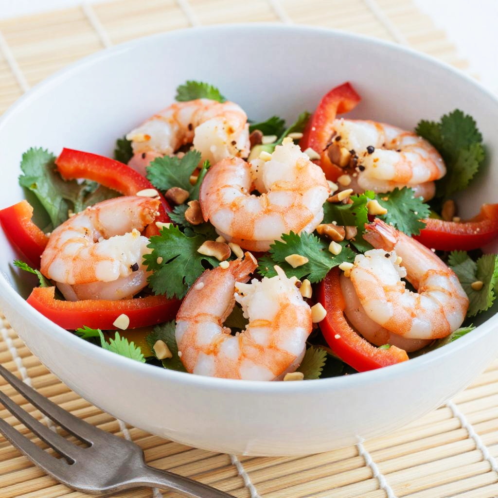 Close-up photo of a colorful salad in a white bowl on a bamboo mat. The salad features shrimp, red bell pepper slices, cucumber, green cilantro leaves, and crunchy nuts. The shrimp are pink and look fresh, the bell peppers add a vibrant red contrast, and the cilantro adds a fresh green touch. A silver fork is placed in the foreground, slightly to the left.