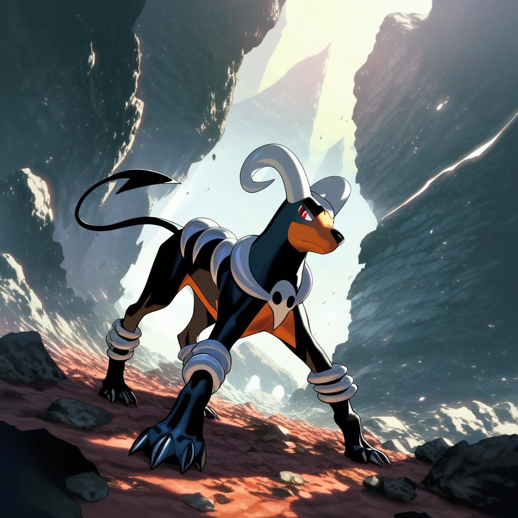 Houndoom, pokemon, no humans, horns, red eyes, black hair, pokemon (creature), claws, by artist koyama hirokazu, animagine