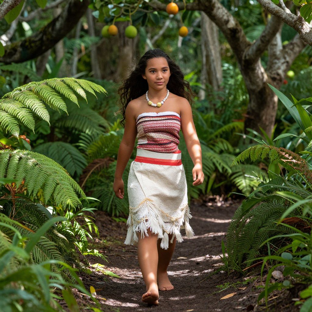 A dynamic wide-angle photo of Moana in her classic costume, walking through a lush jungle clearing with ferns and fruit trees, her face illuminated by dappled sunlight, the costume slightly moving with the breeze, showing realistic fabric texture and cultural authenticity