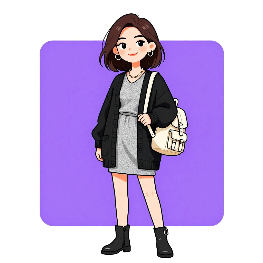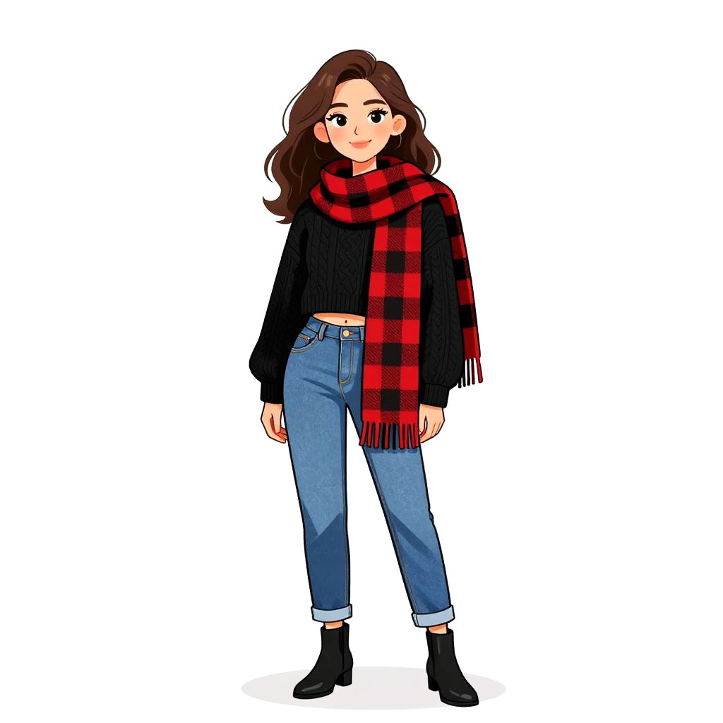 Digital illustration of a young woman with light skin and brown, wavy hair. She wears a black, long-sleeve sweater, red and black checkered scarf, blue, high-waisted jeans with cuffs rolled up, and black ankle boots. She stands against a plain white background, with a slight smile and relaxed posture. The art style is clean and cartoonish, with bold colors and simple lines. The scarf's red and black checkered pattern contrasts with her black top and blue jeans.