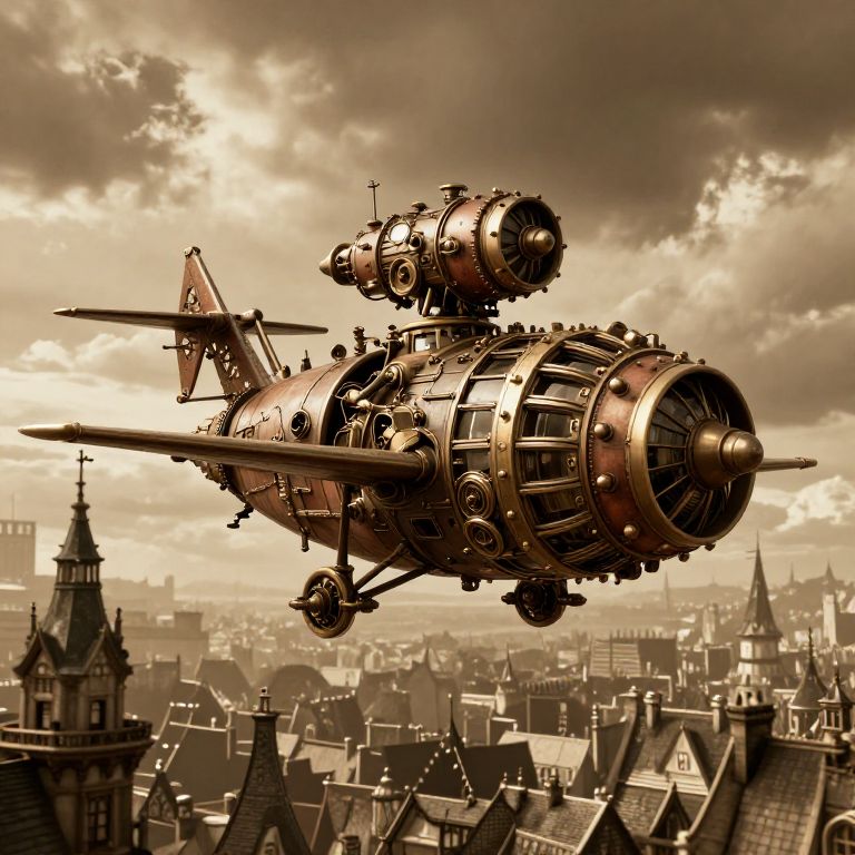 Dall E 3 image generator illustrating a steampunk-inspired flying machine soaring above a Victorian-era city, intricate mechanical details, warm sepia tones, dramatic clouds, and atmospheric perspective.