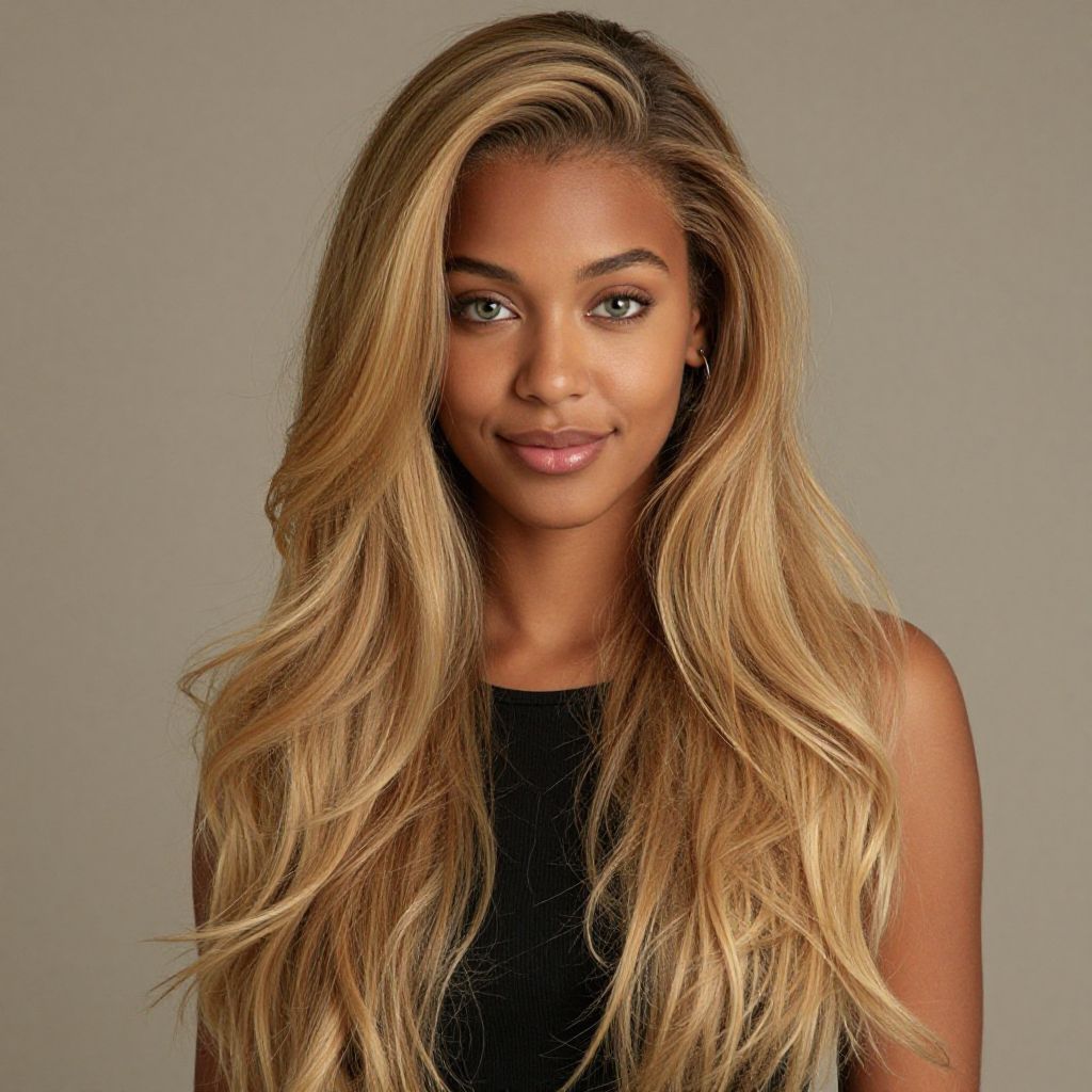Photograph of a young Black woman with long, wavy blonde hair that has darker roots. She has medium brown skin, blue eyes, and full lips with a subtle pink gloss. She is wearing a black sleeveless top. The background is a plain, light gray. Her hair is styled to frame her face, with loose curls cascading over her shoulders. She is looking directly at the camera with a slight, confident smile. The lighting is even, highlighting her hair's texture and color. The overall style is modern and polished.