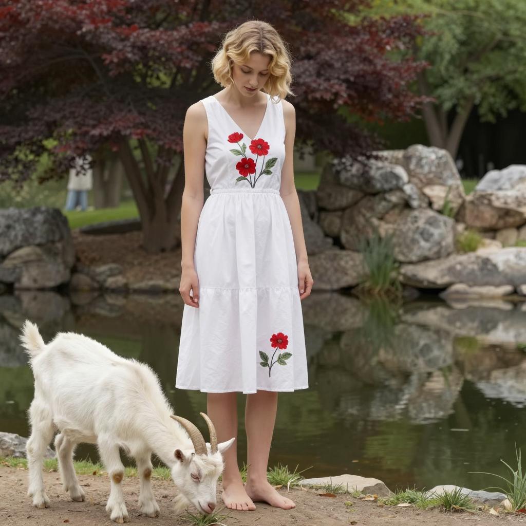 Woman with short blonde hair, wearing a white dress with red flower pattern, stands barefoot by a pond. She looks down at a small white goat with short horns grazing near her feet. Background includes dark red trees, green foliage, and rocky terrain. Pond reflects surrounding greenery. Woman's dress is sleeveless, white with red flowers on the chest. Scene is outdoors with a natural setting. Woman stands slightly to the left, goat to the left of her.