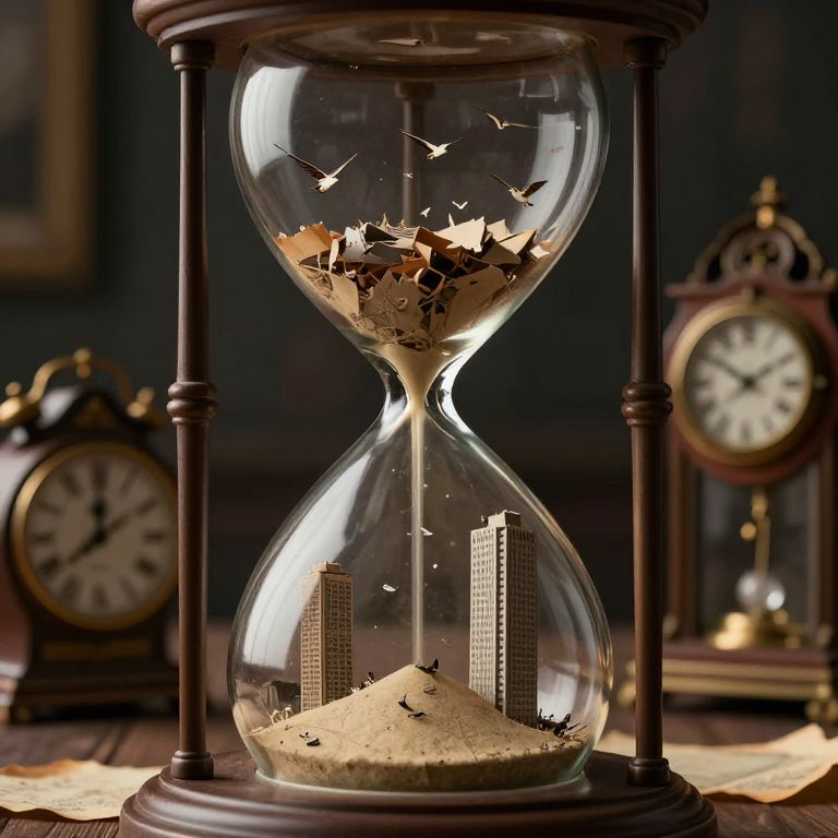 Inside an inverted hourglass, time crawls upward as modern skyscrapers collapse into antique clocks and forgotten parchment birds.