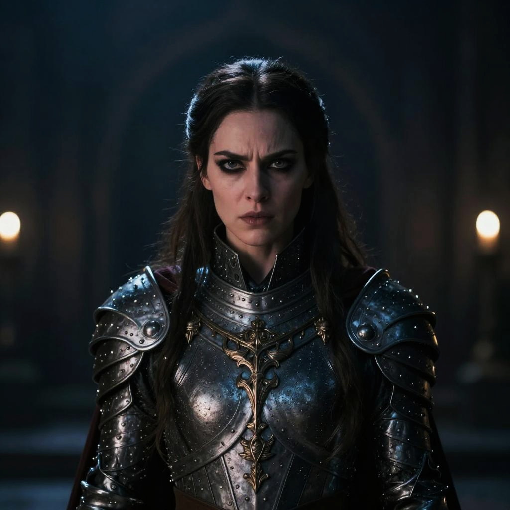 A dramatic photograph of a serious-faced woman with long dark hair, wearing reflective, silver-plated medieval armor with intricate designs. Her intense gaze is directed at the camera, illuminated by a subtle, dark blue light. The background is blurred with dim, warm lights, creating a moody, atmospheric setting. The armor's metallic sheen contrasts with her pale skin, emphasizing her determined expression. The image has a cinematic quality, reminiscent of a fantasy or historical action film.