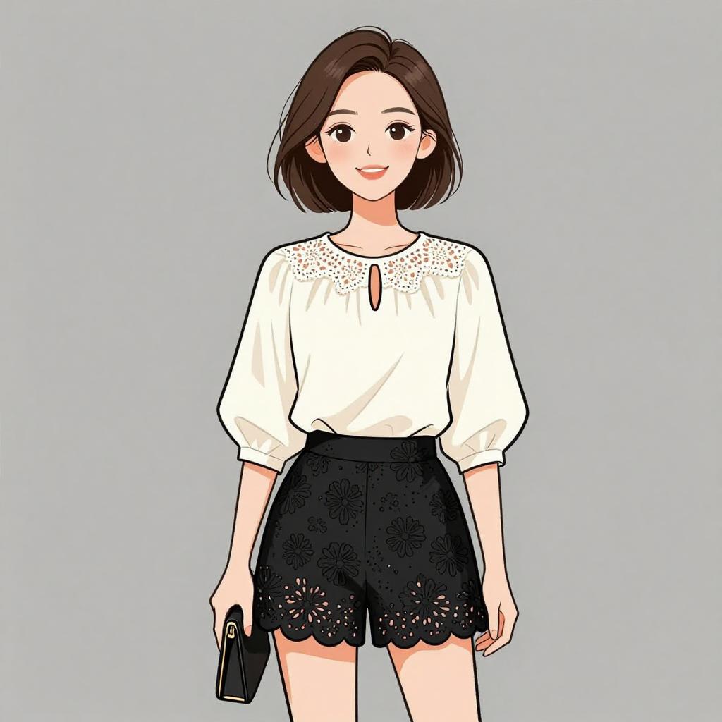 Woman with pretty face and pretty hair. smiling Woman, casual chic, white blouse with 3/4 sleeves, delicate lace trim at neckline with small keyhole detail, paired with black scalloped-hem shorts featuring a floral laser-cut pattern, holding a slim black clutch. --sref 1467