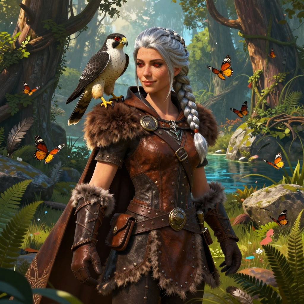 A digital fantasy artwork depicts a white-haired woman with braided hair standing in a vibrant forest. She wears a dark brown, fur-trimmed leather armor with intricate metal buckles. Perched on her right shoulder is a black and white falcon. Orange butterflies flutter around her. The background features tall trees, lush greenery, and a serene blue stream. Sunlight filters through the trees, creating a magical, enchanted atmosphere. The woman's confident expression and poised stance suggest strength and wisdom. The detailed textures of her armor and the forest elements enhance the realism of the scene.