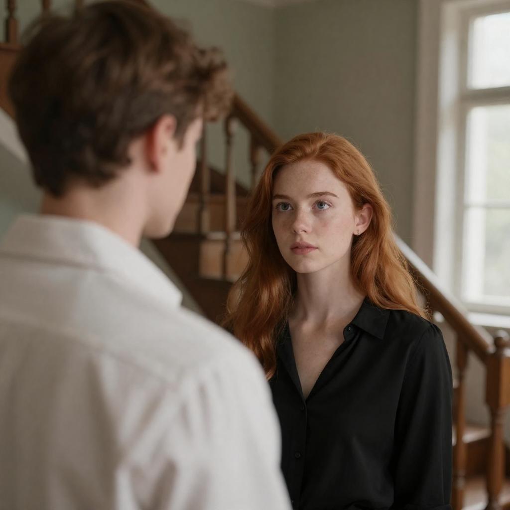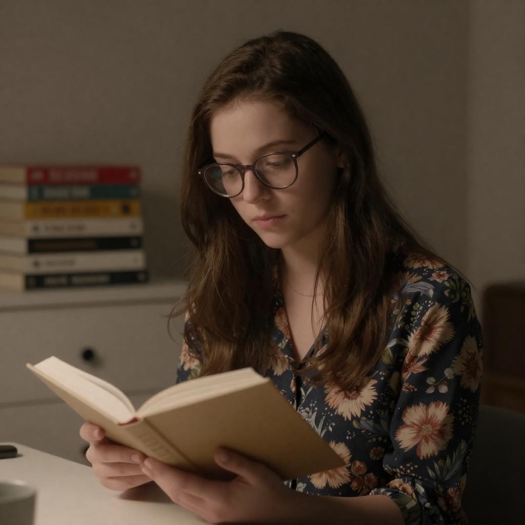 Woman with red hair, bangs, and floral shirt, intently looking at smartphone. Soft bokeh lights in dark background. Hands holding phone close to face. Pale skin, light makeup. Upper body shot. Casual, focused expression. Blurred background elements.