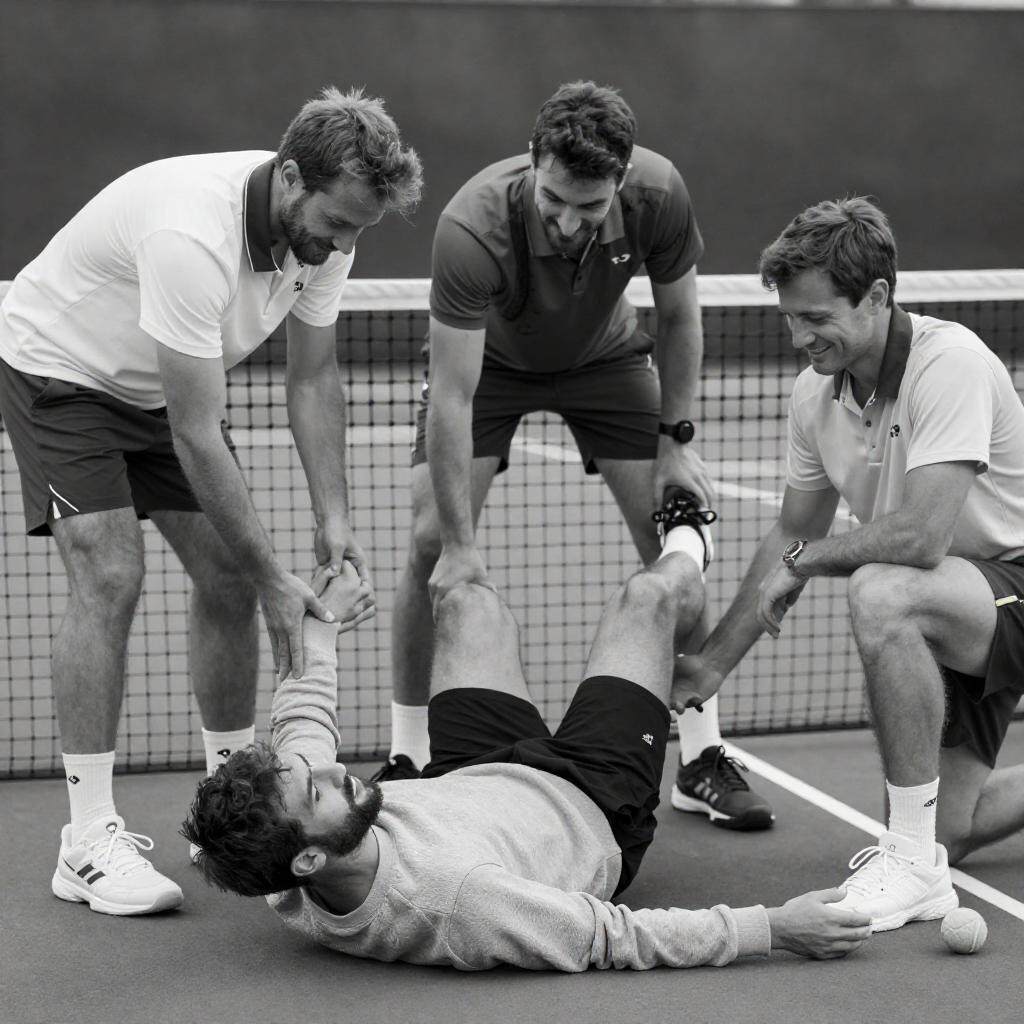 Black-and-white photograph of four men on a tennis court. Man on ground, wearing light-colored sweater, lying down with legs raised. Three men in athletic wear, two standing, one kneeling, assisting. Net in background. Man on ground with curly hair, beard, intense expression. Other men smiling, focused on helping. Tennis balls and towels visible.